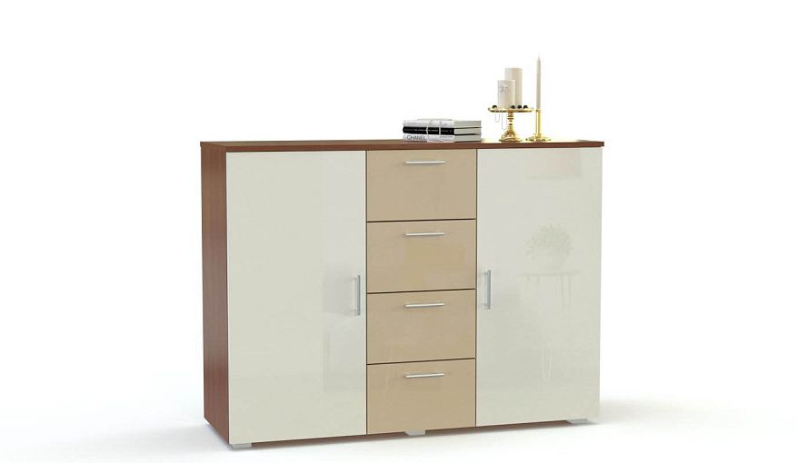Комод Элегия 2 BMS станет элементом дизайна в интерьере современной спальни или гостиной. Глянцевая модель сочетает в оформлении фасада белый и нежную ваниль, а корпус выполнен в светлых древесных тонах. Ряд из четырех выдвижных ящиков дополнен расположенными по бокам распашными отделениями с полками, широкая столешница разместит книги, предметы декора и необходимые под рукой мелочи. Купить комод Элегия 2 BMS с выбором цвета и фурнитуры по каталогу вы сможете в нашем интернет-магазине.