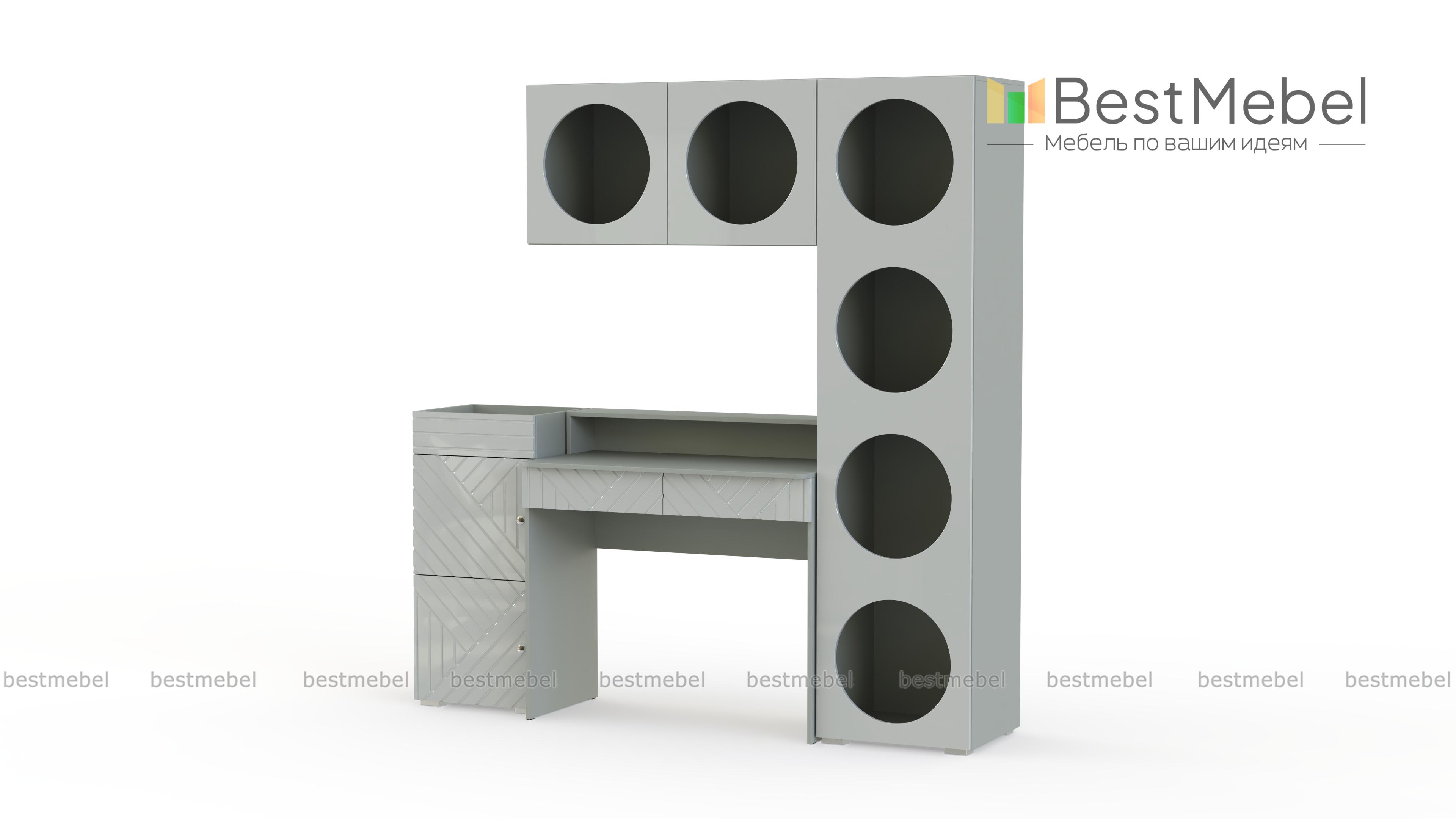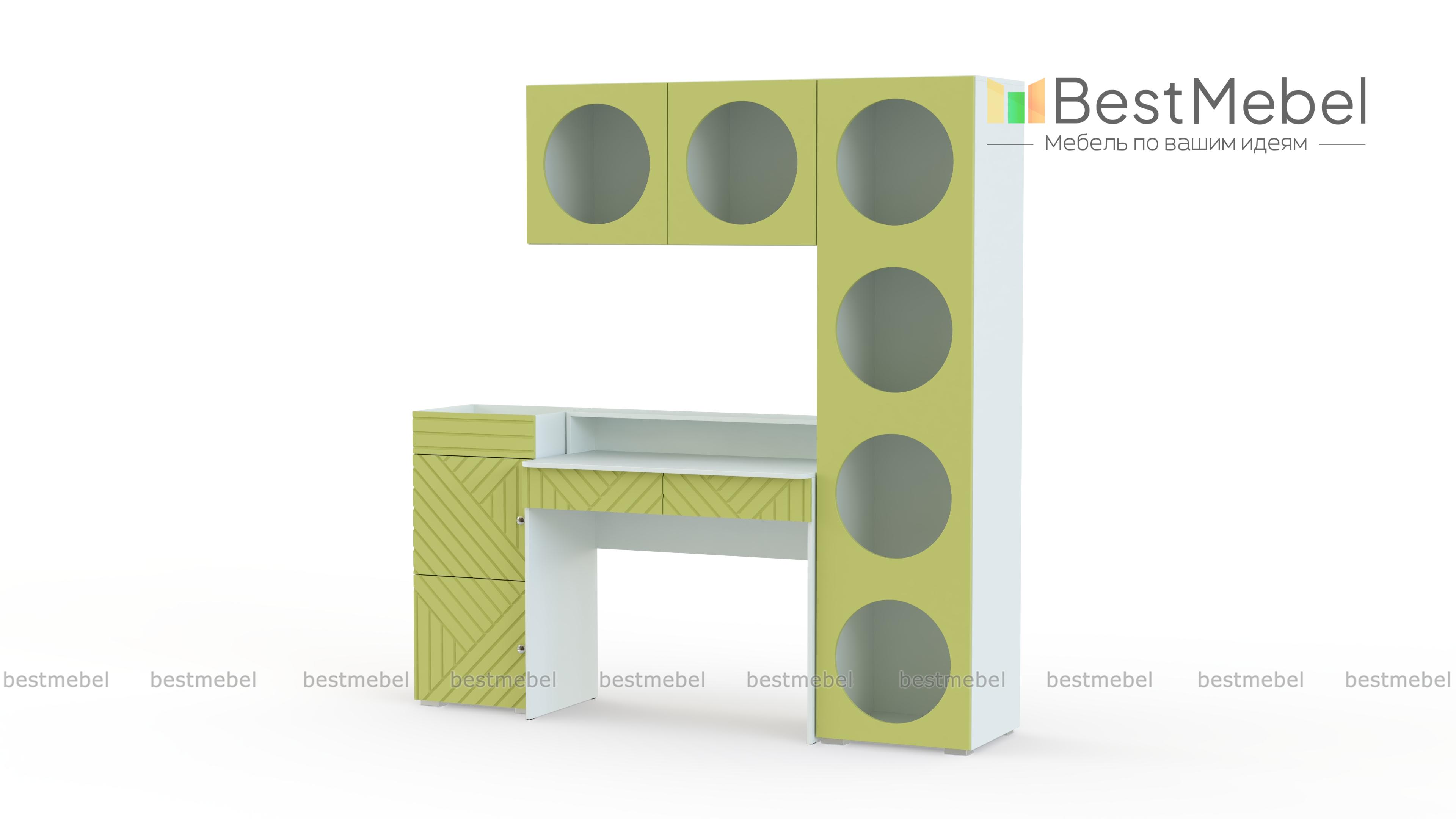 Детская стенка Авелин 10 BMS поможет создать комфортное место для учебы в небольшой комнате. Компьютерный стол с ящиками, тумба, книжный стеллаж и подвесная полка позволят разместить все необходимое в пределах досягаемости. Геометрическая фрезеровка на дверцах, круглые вырезы полок и актуальные оттенки создают динамичный современный дизайн. Купить детскую стенку Авелин 10 BMS с выбором размеров, цвета и типа ручек приглашаем на сайт нашего интернет-магазина.