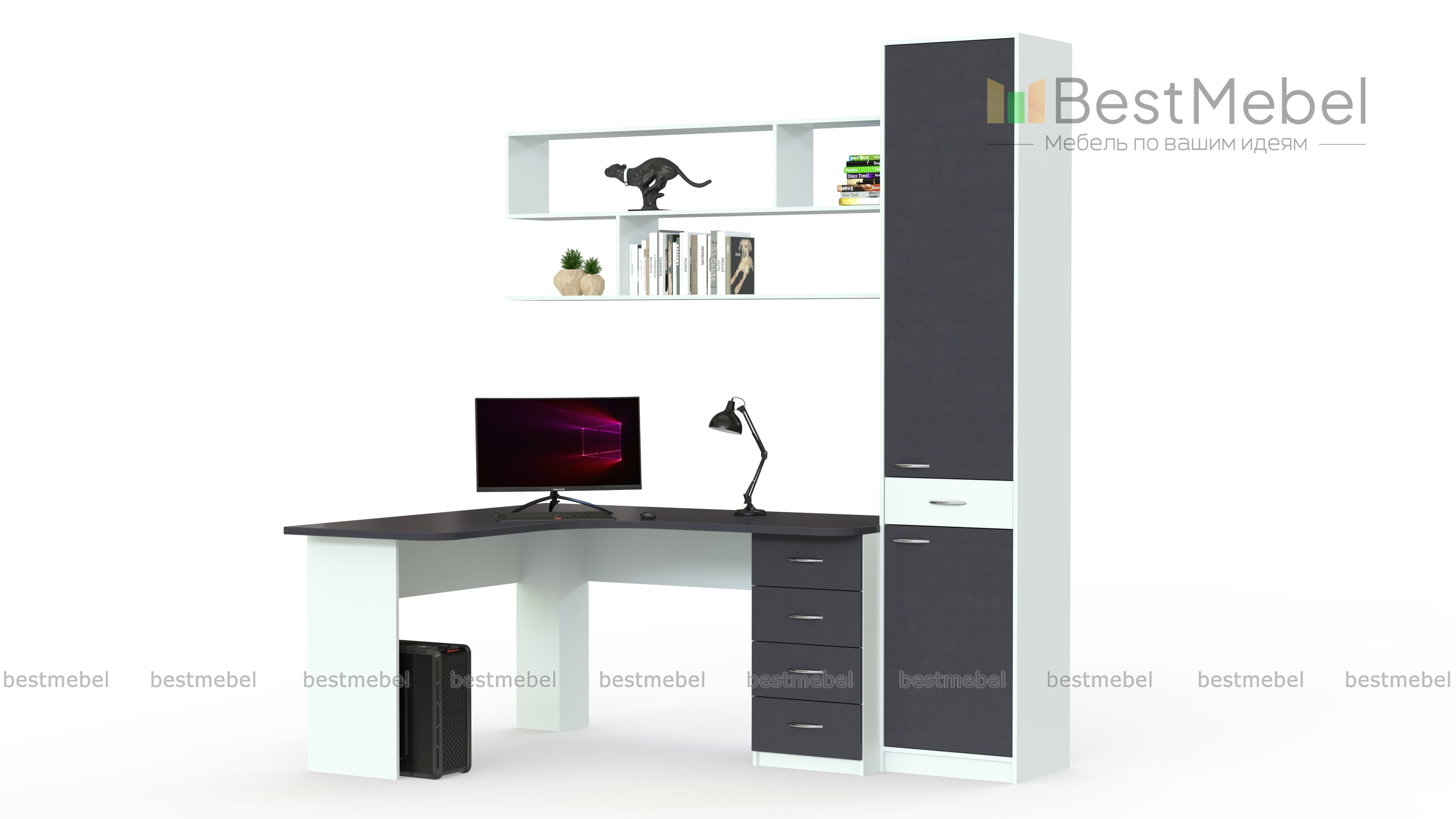 Угловой компьютерный стол со шкафом Марта 12 BMS отличается универсальным современным дизайном и высокой функциональностью. Обустроить комфортную рабочую зону поможет композиция из углового компьютерного стола с тумбой, навесной книжной полки и пенала с двумя распашными дверцами и ящиком для мелочей. Контрастные оттенки подчеркнут строгий и лаконичный дизайн комплекта, а залогом долговечности станут износостойкие материалы. Столешница выполнена из лдсп 22 мм с вырезом и заглушкой под провода.
