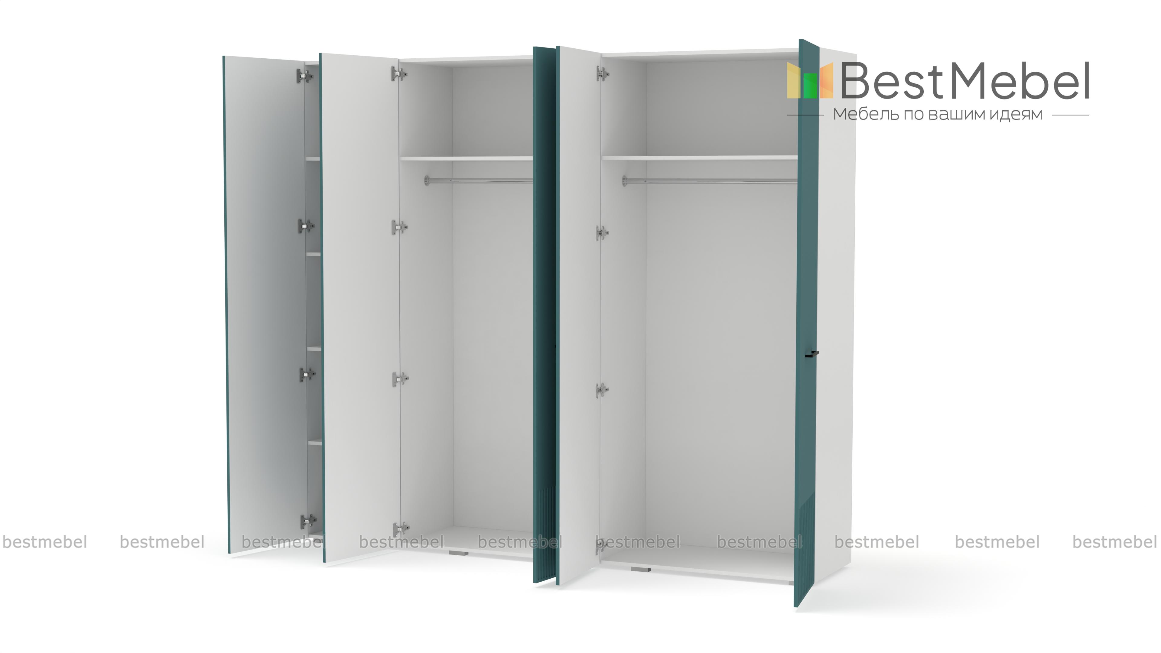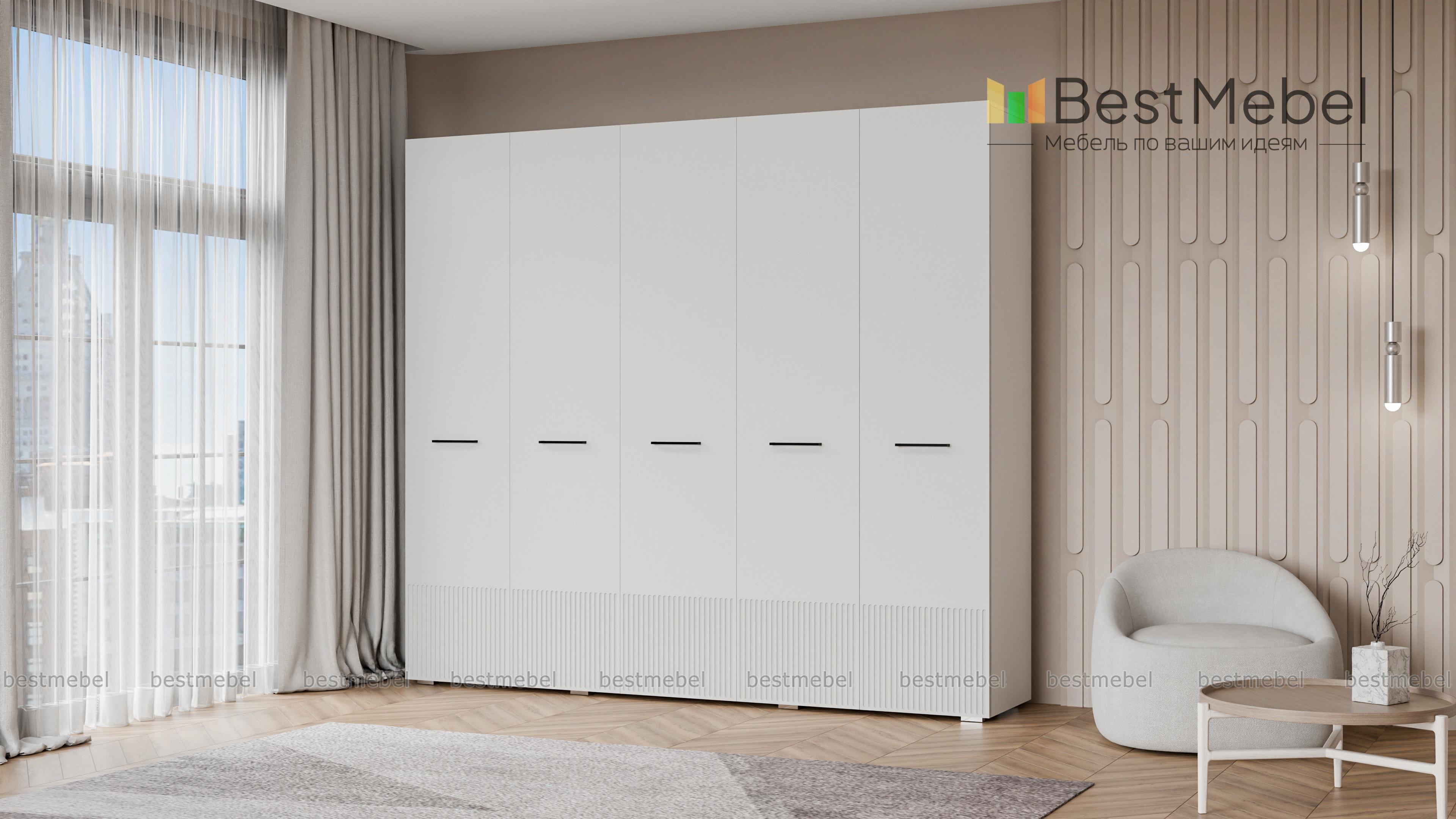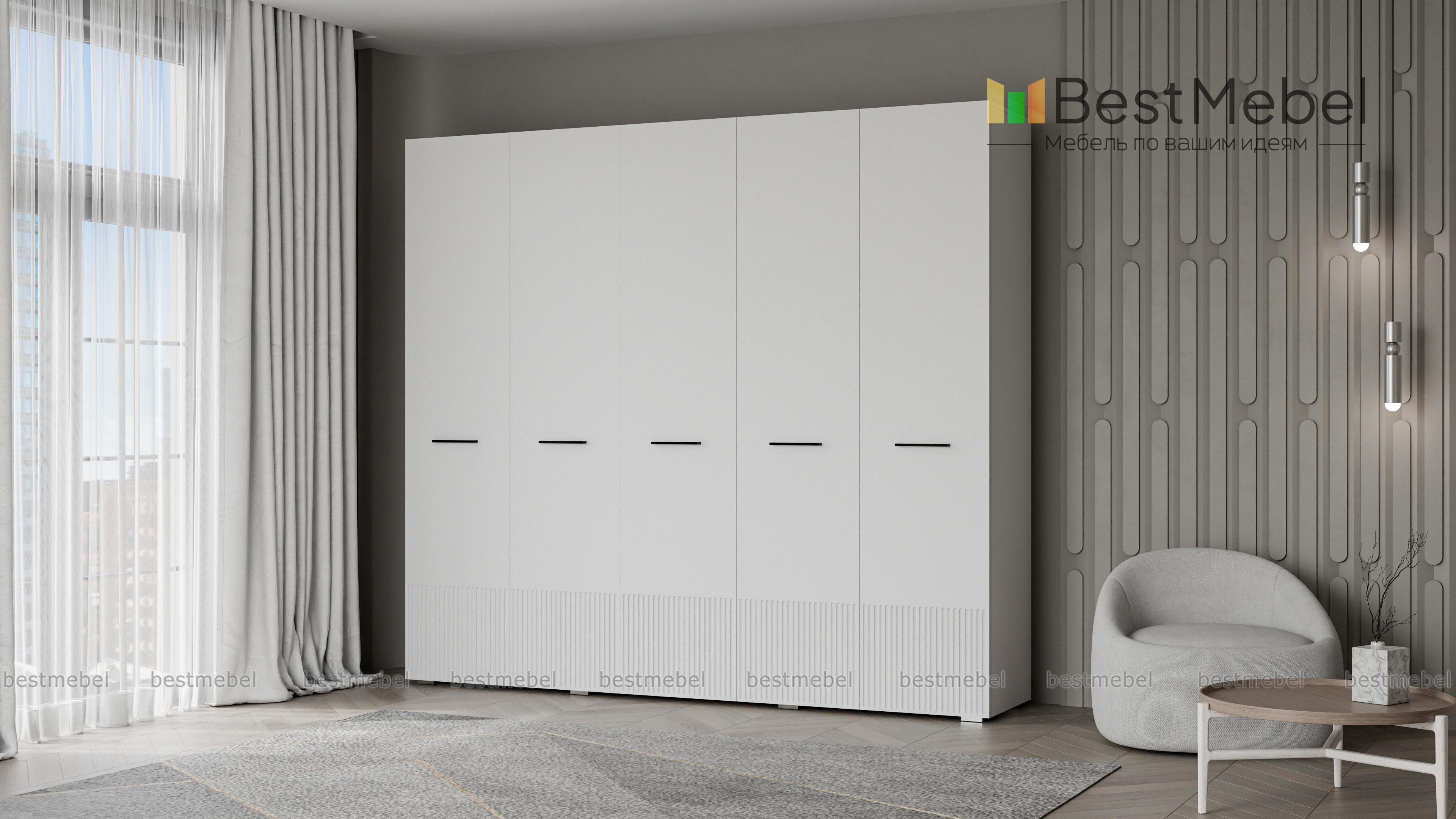 Шкаф распашной Декарт 5 BMS сочетает простую традиционную форму и актуальный дизайн. На сплошном светлом фасаде из МДФ выделяются поперечные ручки-скобы и фрезерованный рельеф, создавая визуально легкую конструкцию. Пятидверный гардероб позволяет организовать хранение с помощью пары штанг, вместительных верхних и бельевых полок. Купить шкаф распашной Декарт 5 BMS в удобном размере и любых оттенках из каталога вы сможете на сайте нашего интернет-магазина.