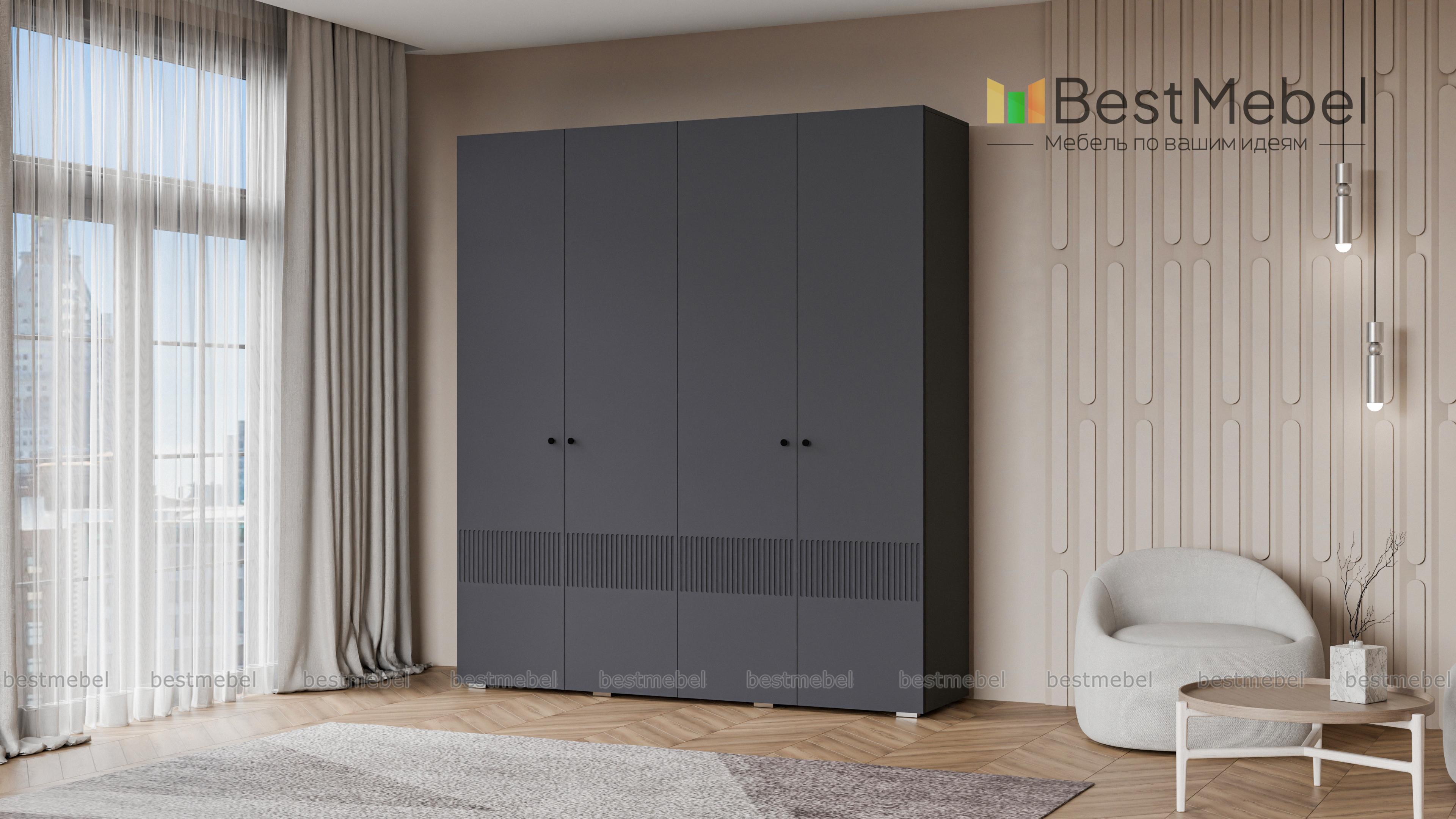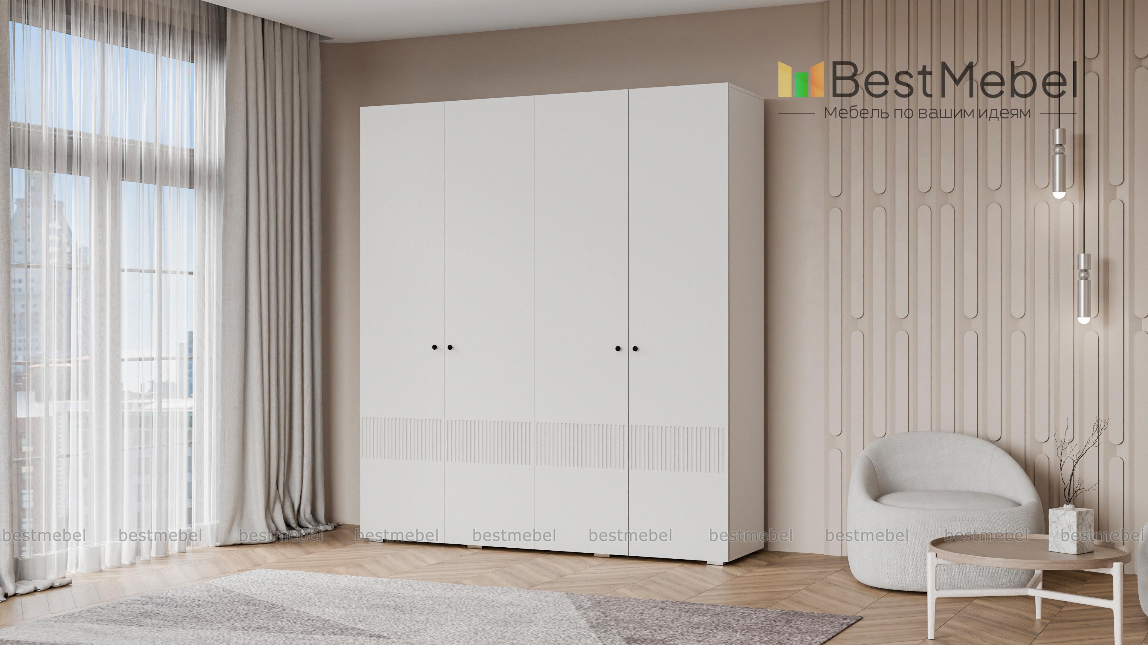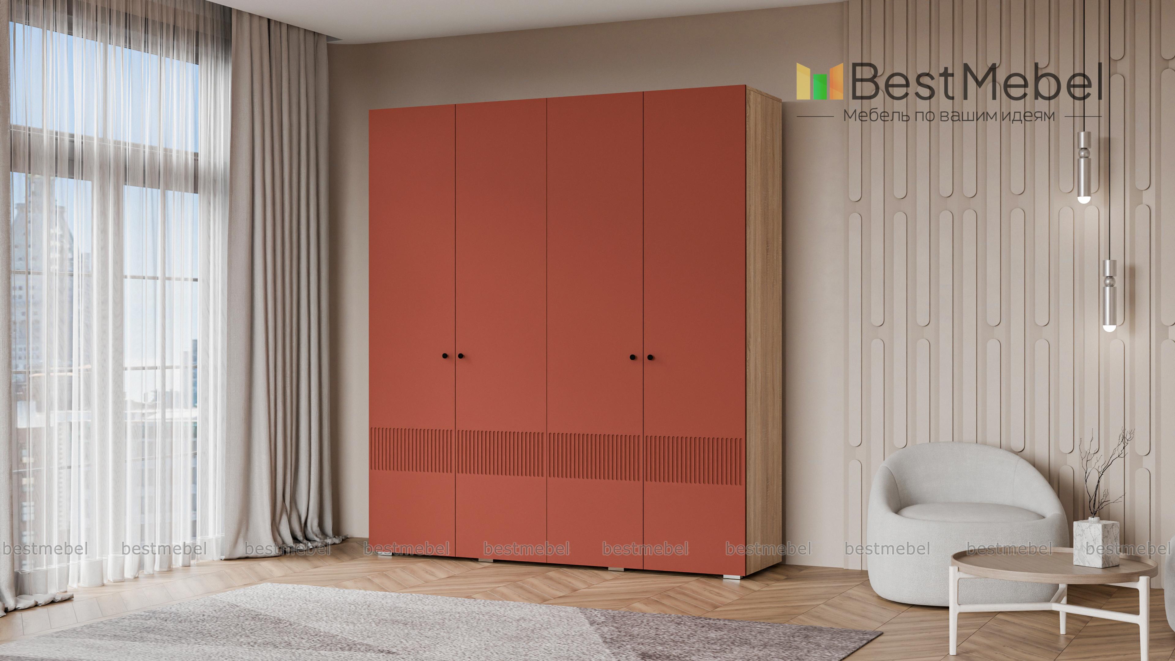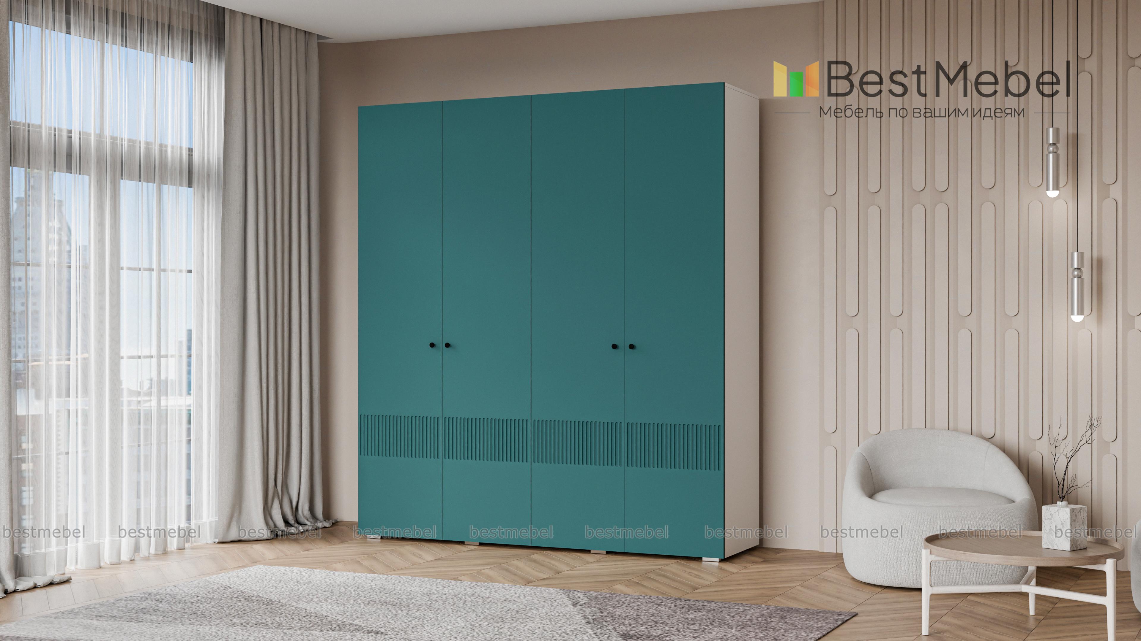 Шкаф распашной Джосс 4 BMS — практичная и стильная четырехдверная модель в прихожую, детскую или спальню. Два отделения со штангами и ряд полок слева помогут вам расположить вещи по категориям — от верхней одежды до трикотажа. Акцентный цветной фасад гардероба украшает фрезеровка, на дверцах установлены миниатюрные круглые ручки. Купить шкаф распашной Джосс 4 BMS вы сможете в нашем интернет-магазине, изменив по желанию размеры, тип ручек и цветовую гамму.