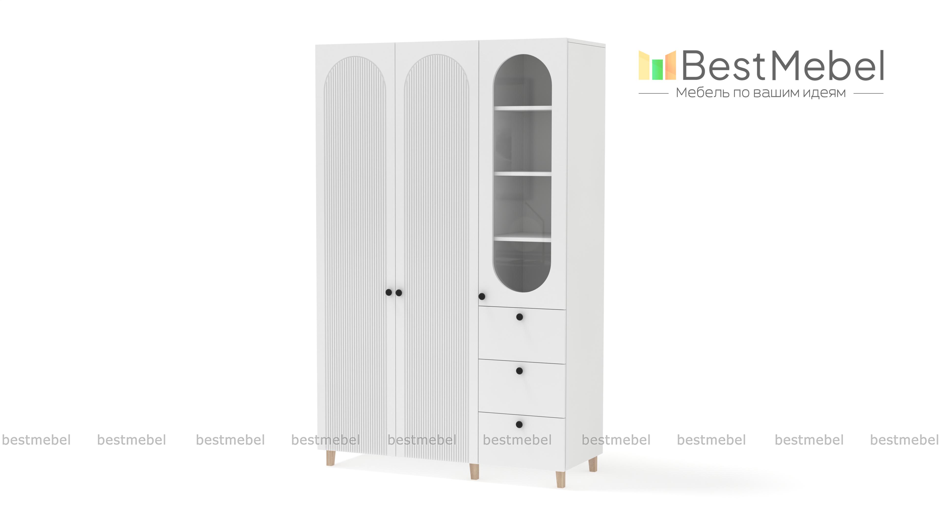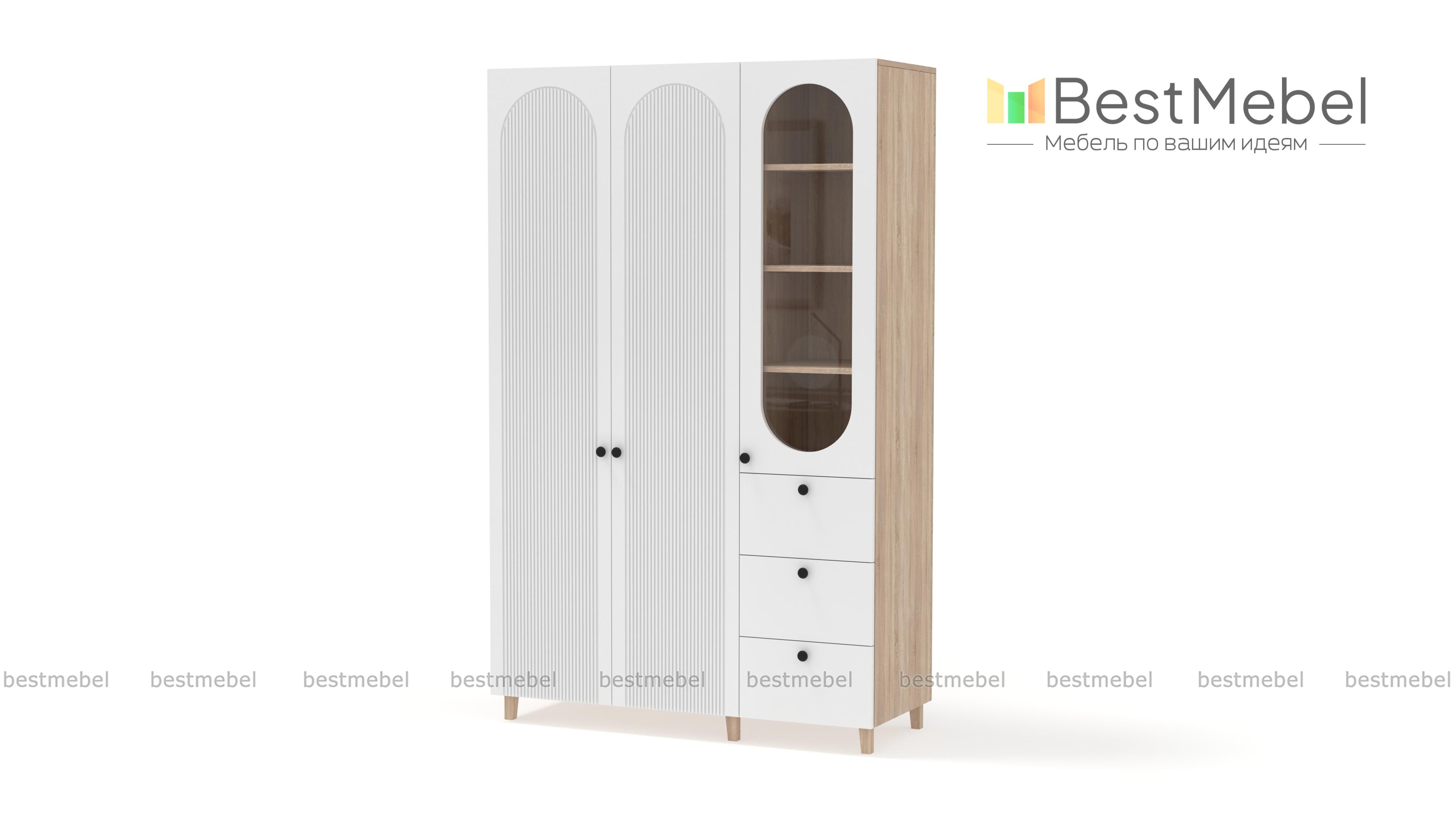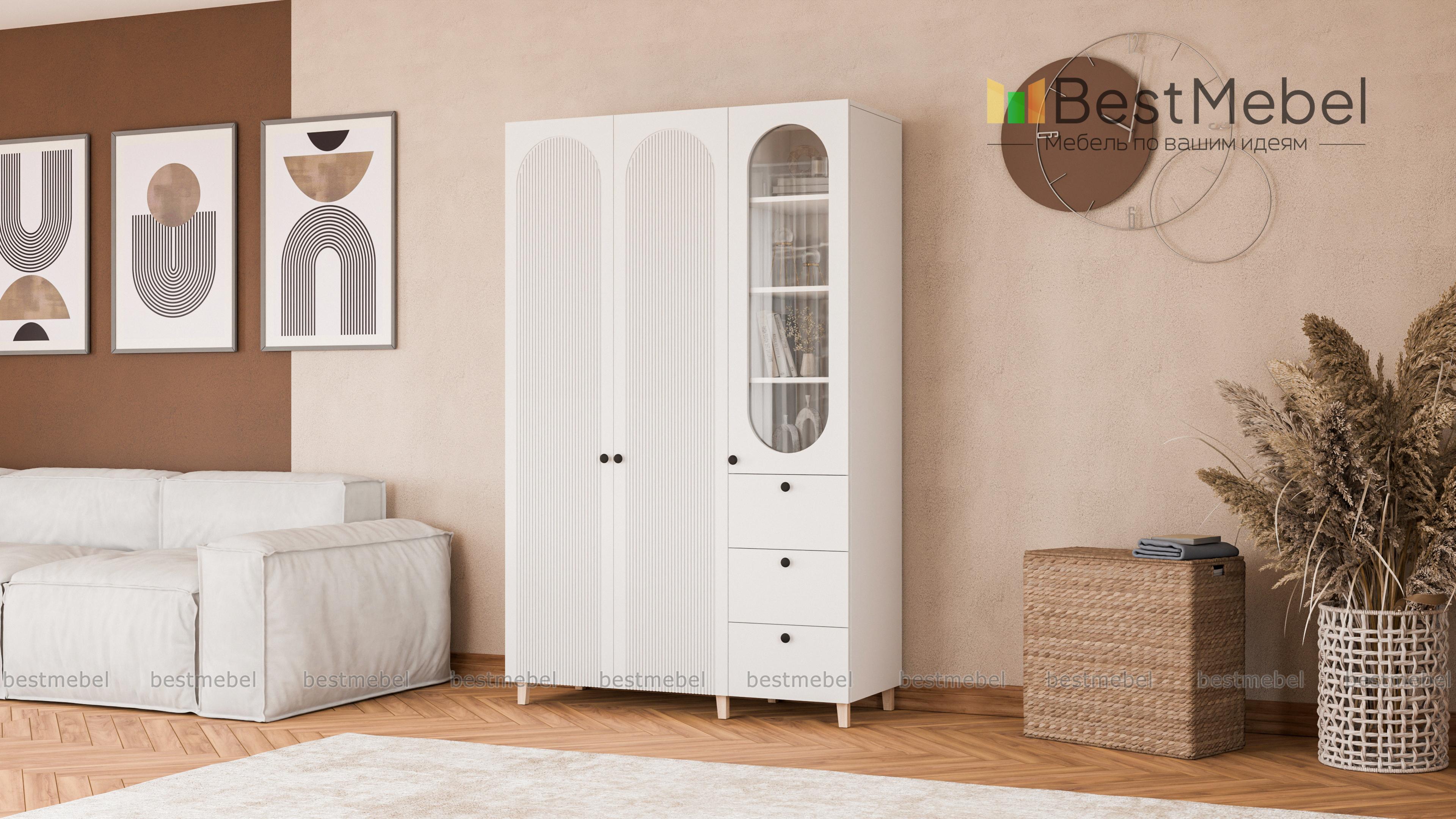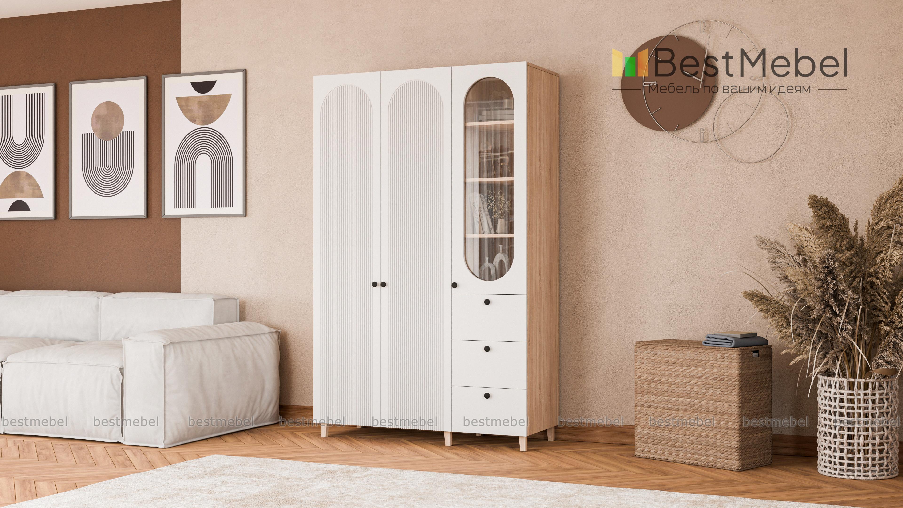 Шкаф распашной Рене 13 BMS объединил для хранения платяное отделение с двумя дверцами и витрину, комбинированную с тремя выдвижными ящиками. Одежда на вешалках, трикотаж, органайзеры с мелочами, книги и декор размещаются компактно и эстетично. Сочетание темных и природных древесных оттенков с декоративными вырезами и фрезеровкой — стильное современное решение. Купить шкаф распашной Рене 13 BMS вы всегда сможете в нашем интернет-магазине с изготовлением по индивидуальным размерам.