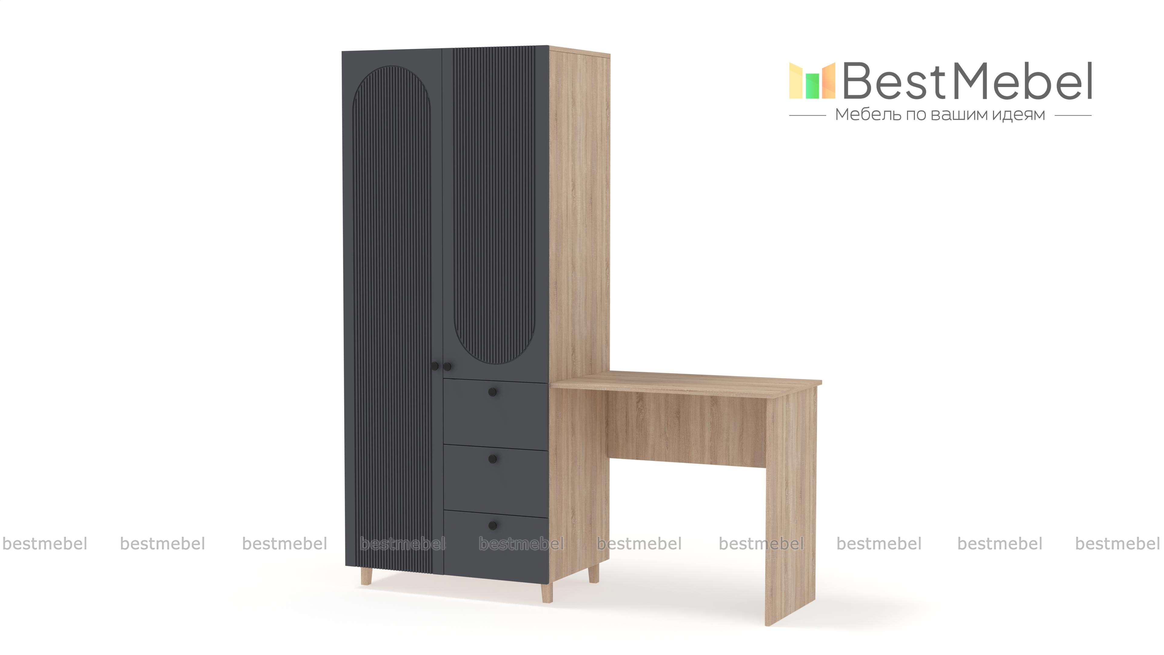 Шкаф со столом Рене 6 BMS объединил рабочую зону и удобную систему хранения. Элегантный гардероб с высокими ножками и фрезеровкой дополнен прямоугольным письменным столом справа. Для хранения вещей предусмотрены распашное отделение и ящики, а размеры столешницы позволяют разместить ноутбук, письменные принадлежности, материалы для творчества. Купить шкаф со столом Рене 6 BMS вы сможете в нашем интернет-магазине, подобрав размеры и наиболее подходящую цветовую гамму.