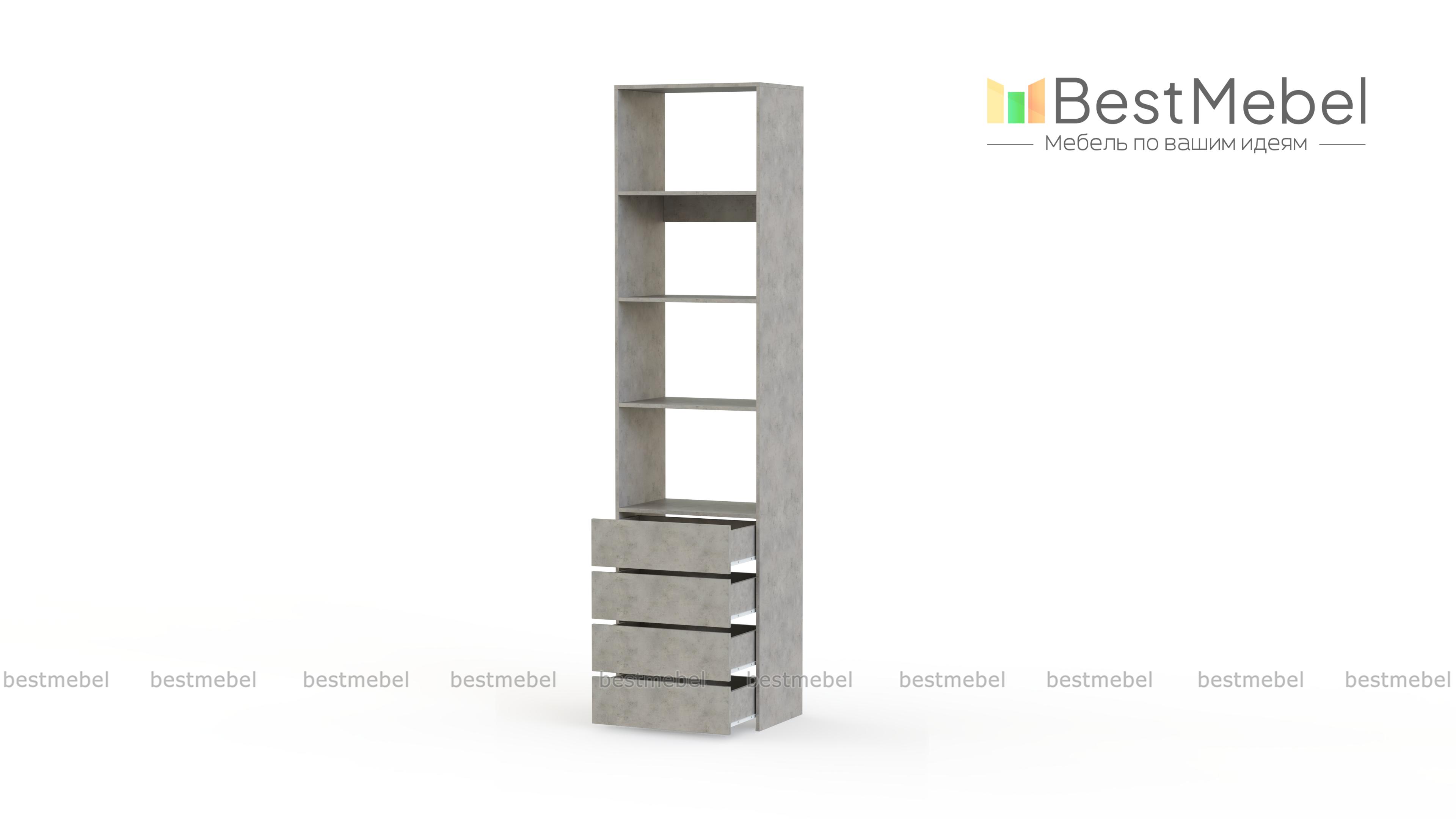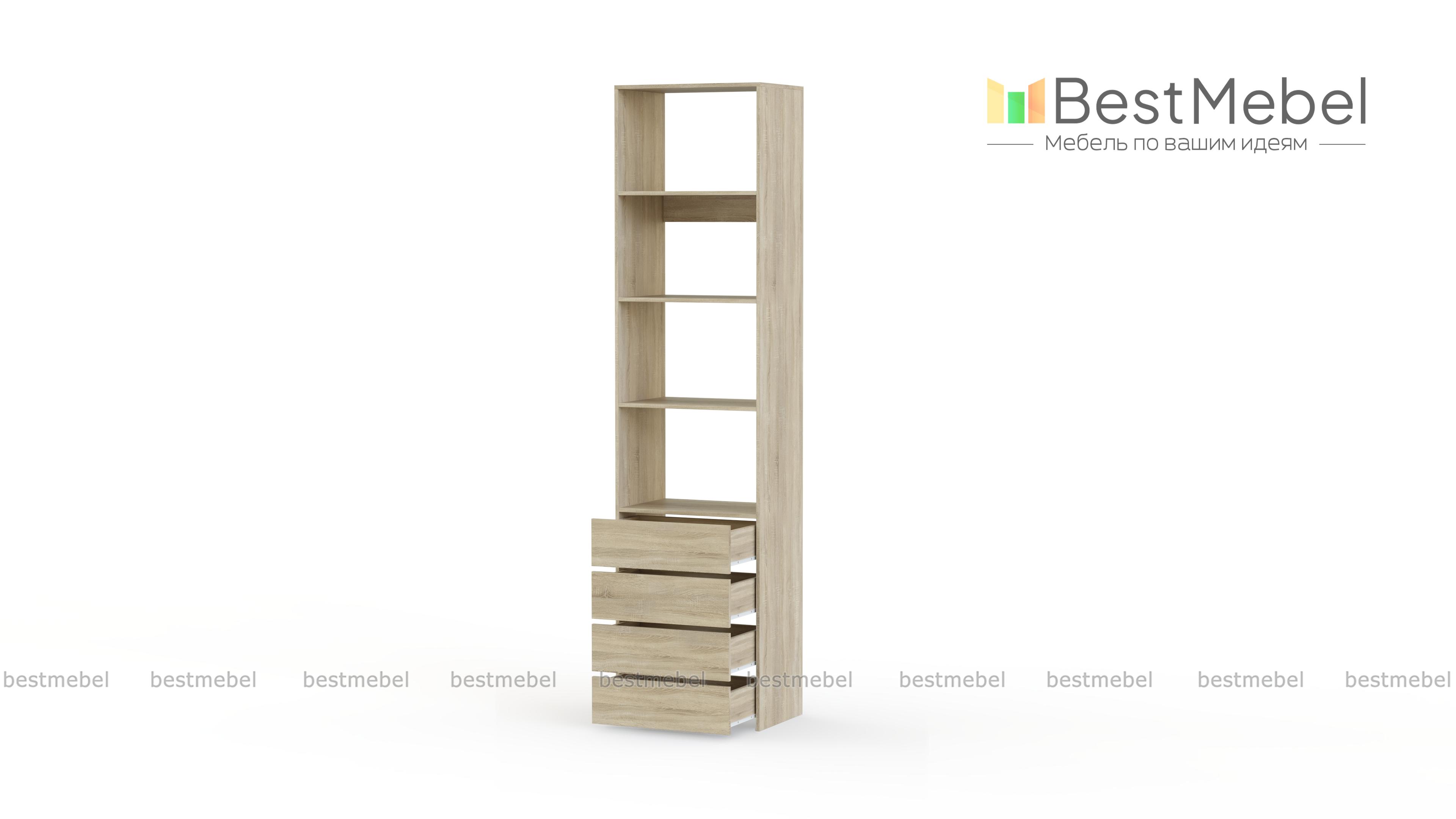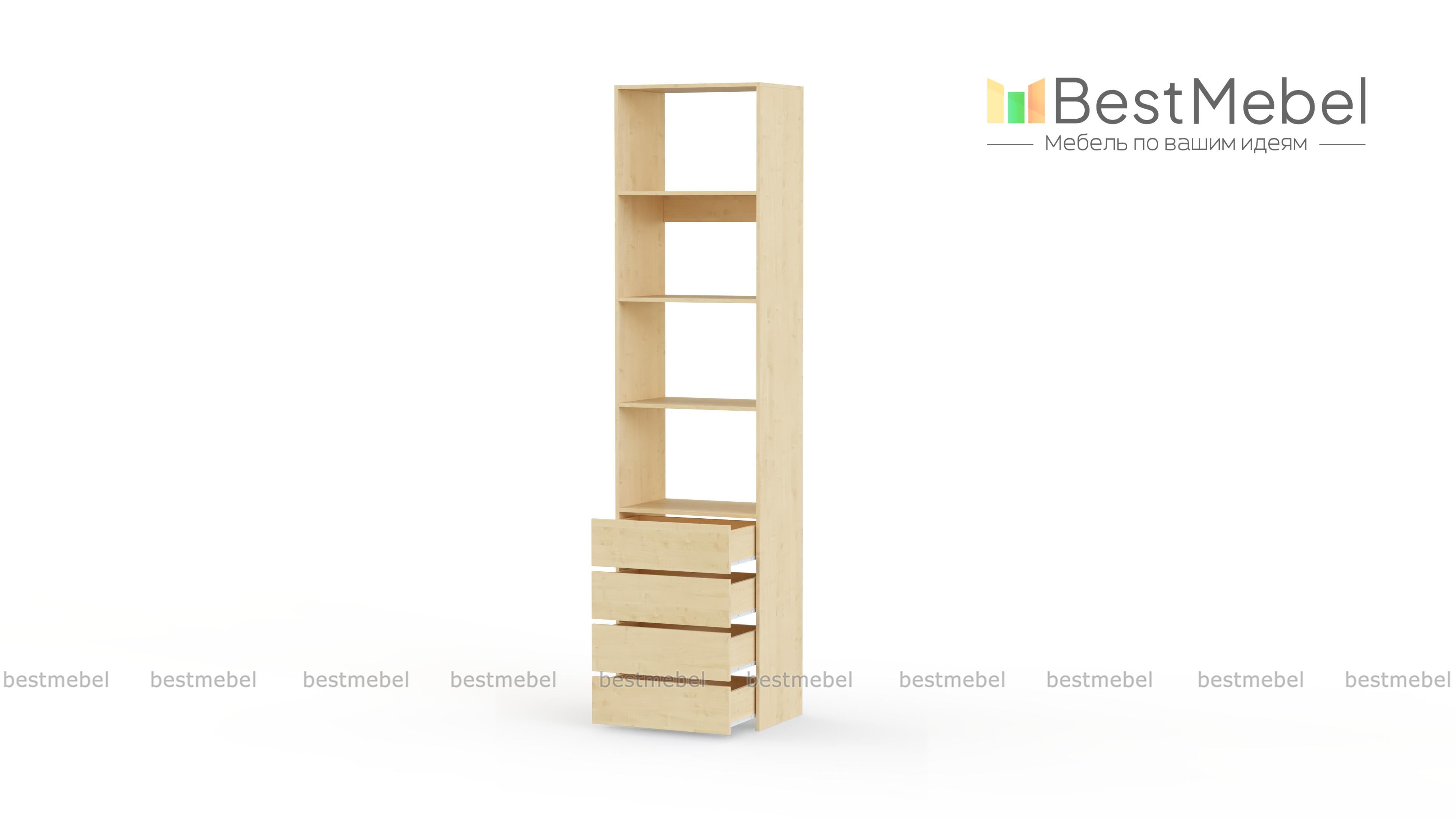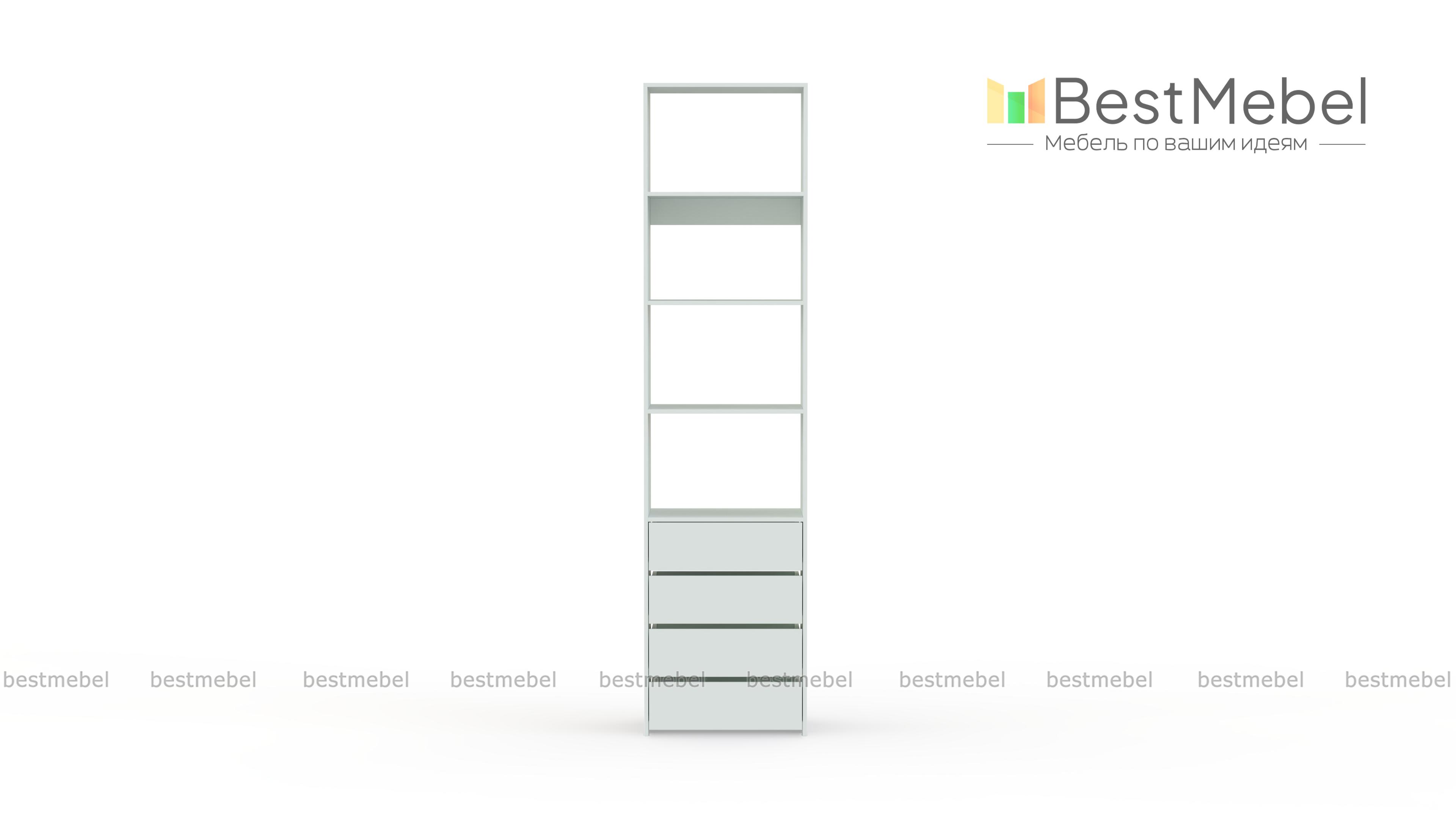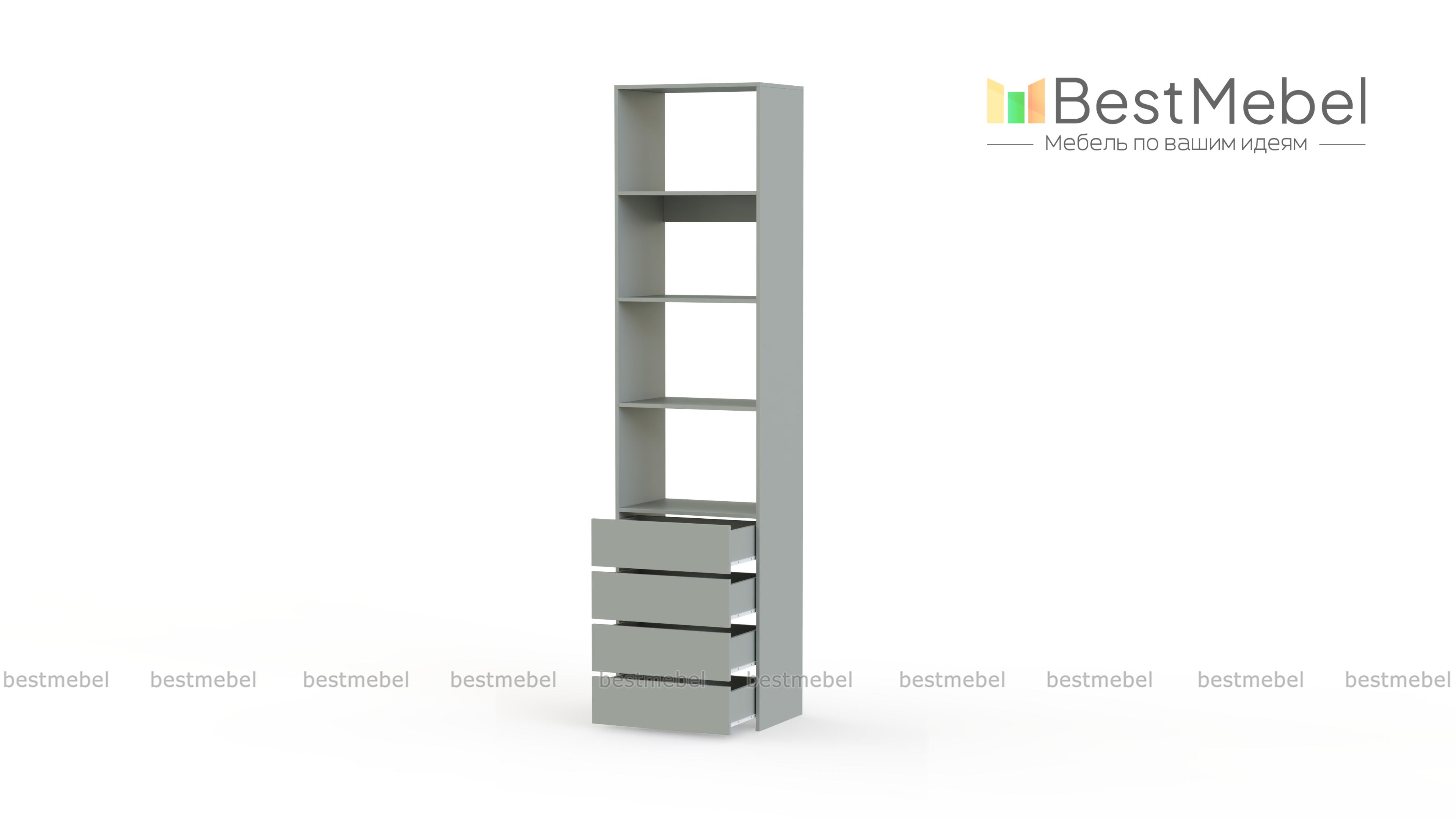 Стеллаж для одежды Мирта 35 BMS может дополнить другие стеллажи серии или использоваться самостоятельно. Три бельевые полки сверху дополнены четырьмя выдвижными ящиками для трикотажа, аксессуаров и прочих мелких вещей. Узкий стеллаж легко вписывается в ниши, маленькие спальни, прихожие или гардеробные, решая проблему ограниченного пространства. Купить стеллаж для одежды Мирта 35 BMS приглашаем в наш интернет-магазин в любом размере и оттенке из каталога.