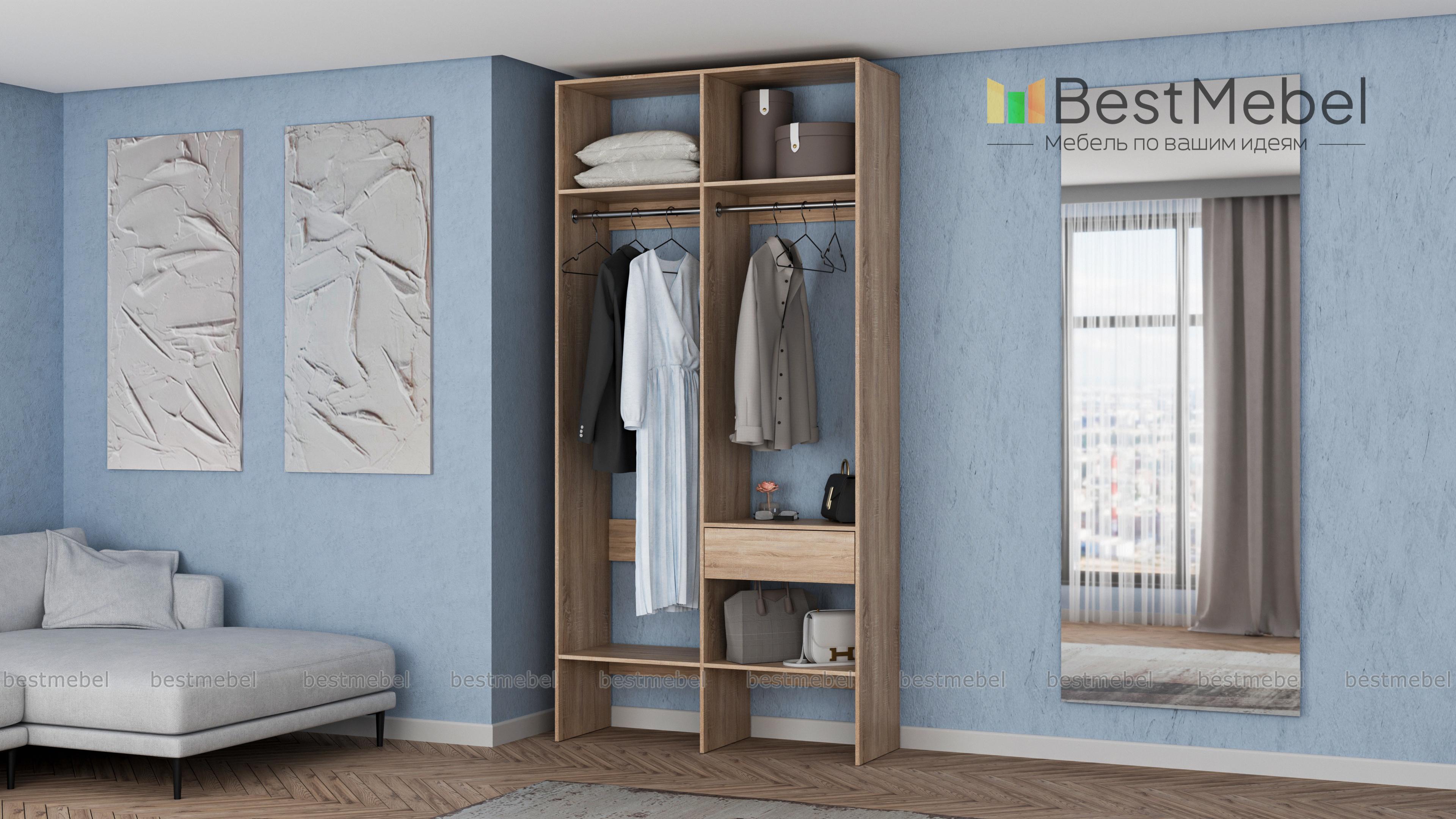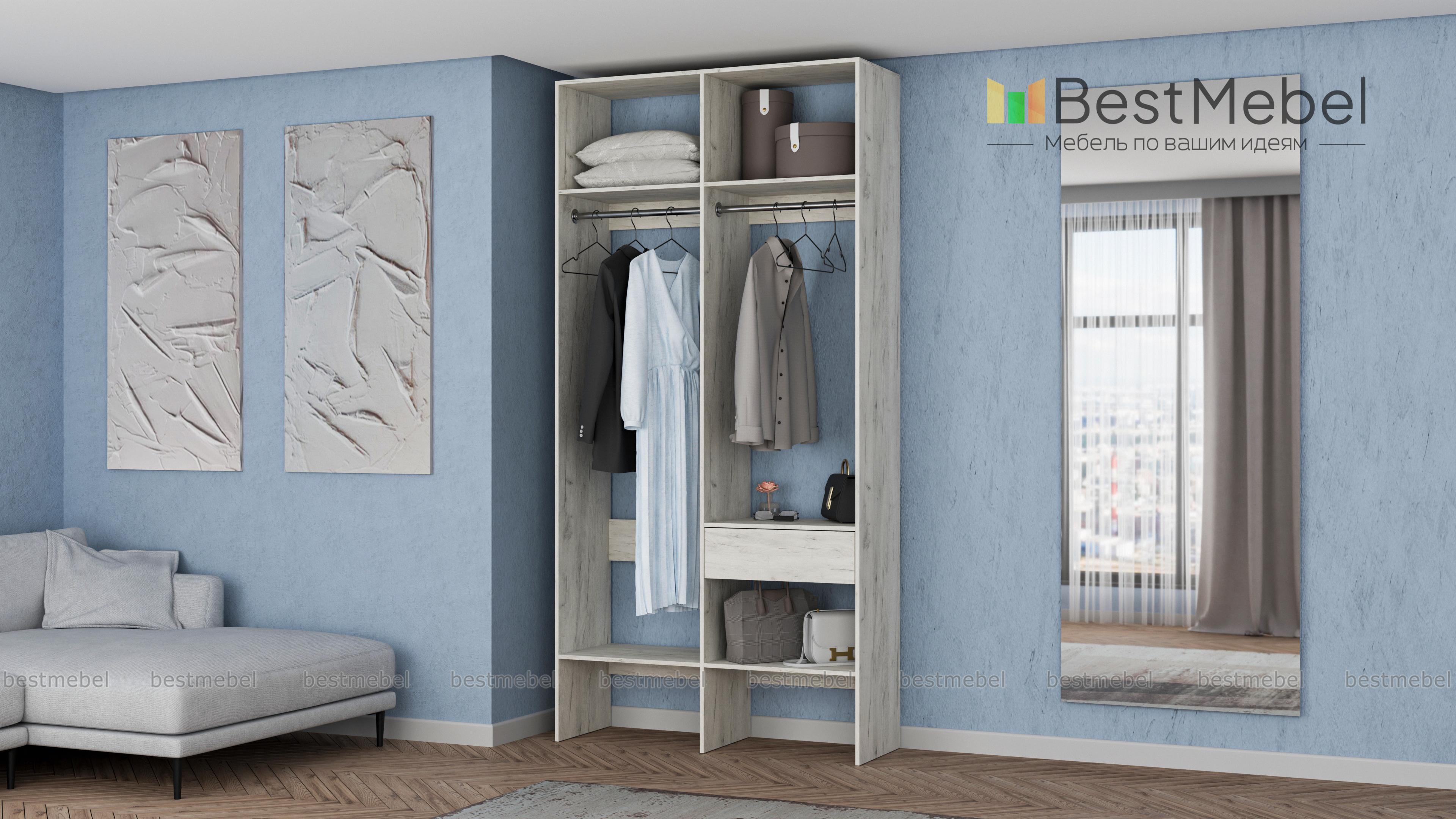 Стеллаж для одежды Мирта 42 BMS для гардеробной или прихожей выполнен в нейтральном светлом оттенке из ламинированной ДСП. Компактная и легкая двухсекционная конструкция объединила два платяных отделения разной высоты, верхние и нижние полки, а также выдвижной ящик, предназначенный для мелочей. В открытом стеллаже будут всегда на виду ваша повседневная одежда и обувь. Купить стеллаж для одежды Мирта 42 BMS вы сможете в нашем интернет-магазине, самостоятельно подобрав размеры и цвет.