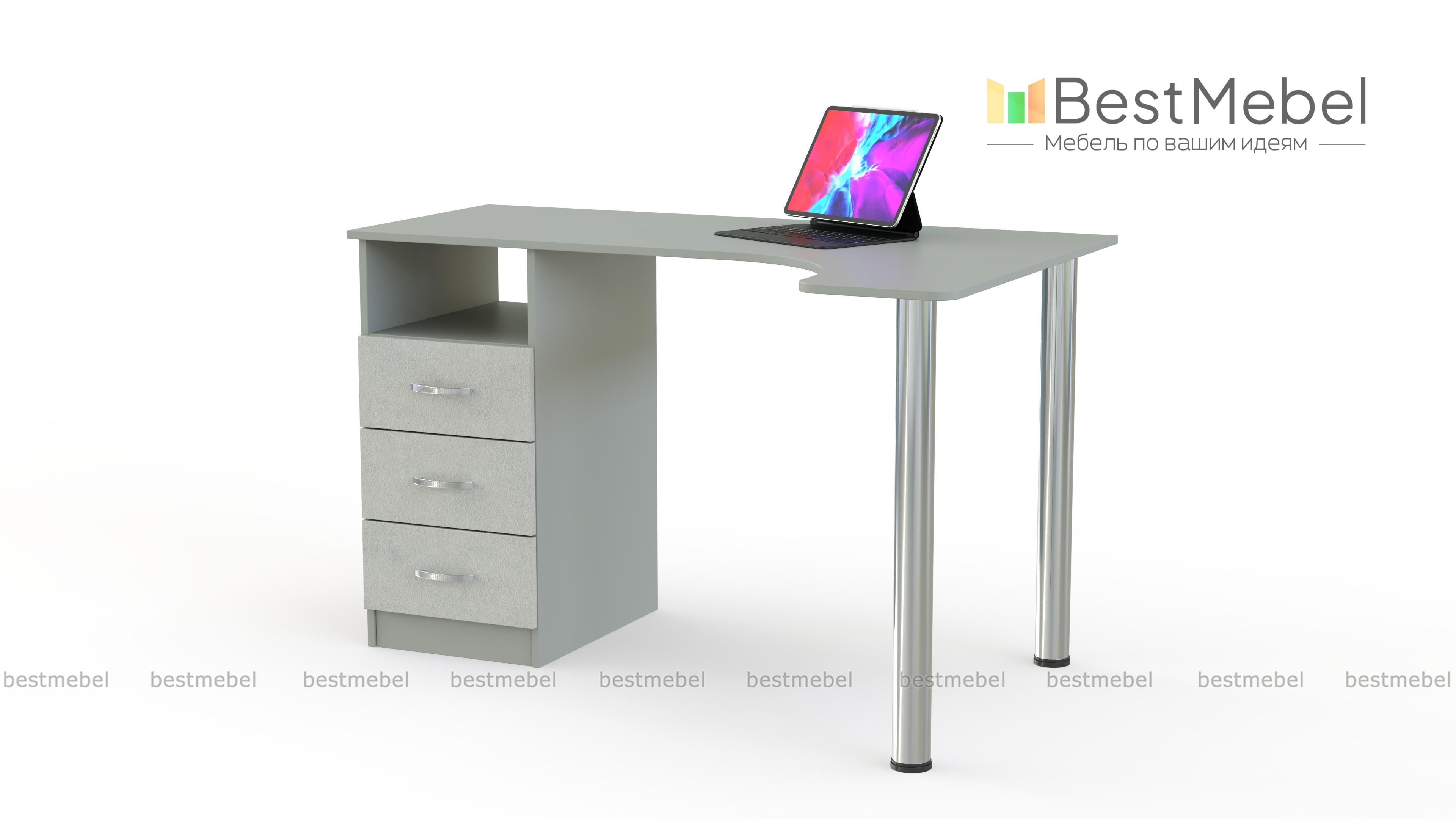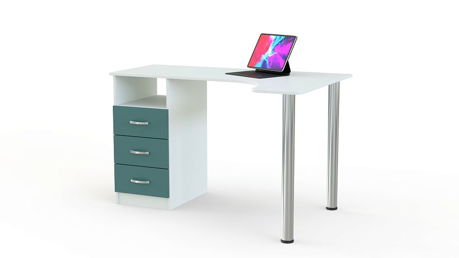 Письменный стол Беллатриса 1 BMS является компактной и современной моделью. Две металлические ножки обеспечивают хорошую опору и облегчают конструкцию. В качестве еще одной опоры выступает модуль из выдвижных ящиков. Стол занимает угловое пространство и имеет эргономичную столешницу со сглаженными углами. Стол в любом цветовом решении будет выглядеть стильно и современно, ведь его конструкция легкая и практичная. Эта идеальная модель для офиса или call-центра, а также для дома. На столе будет достаточно места для монитора или ноутбука, а выдвижные ящики вместят много бумаг и личных вещей. С таким столом уборка в помещении будет легкой и быстрой. Выбирайте расцветки, определяйтесь с размером и звоните нашему менеджеру. Заказать письменный стол Беллатриса 1 BMS можно в нашем интернет-магазине, оформив заказ на сайте.