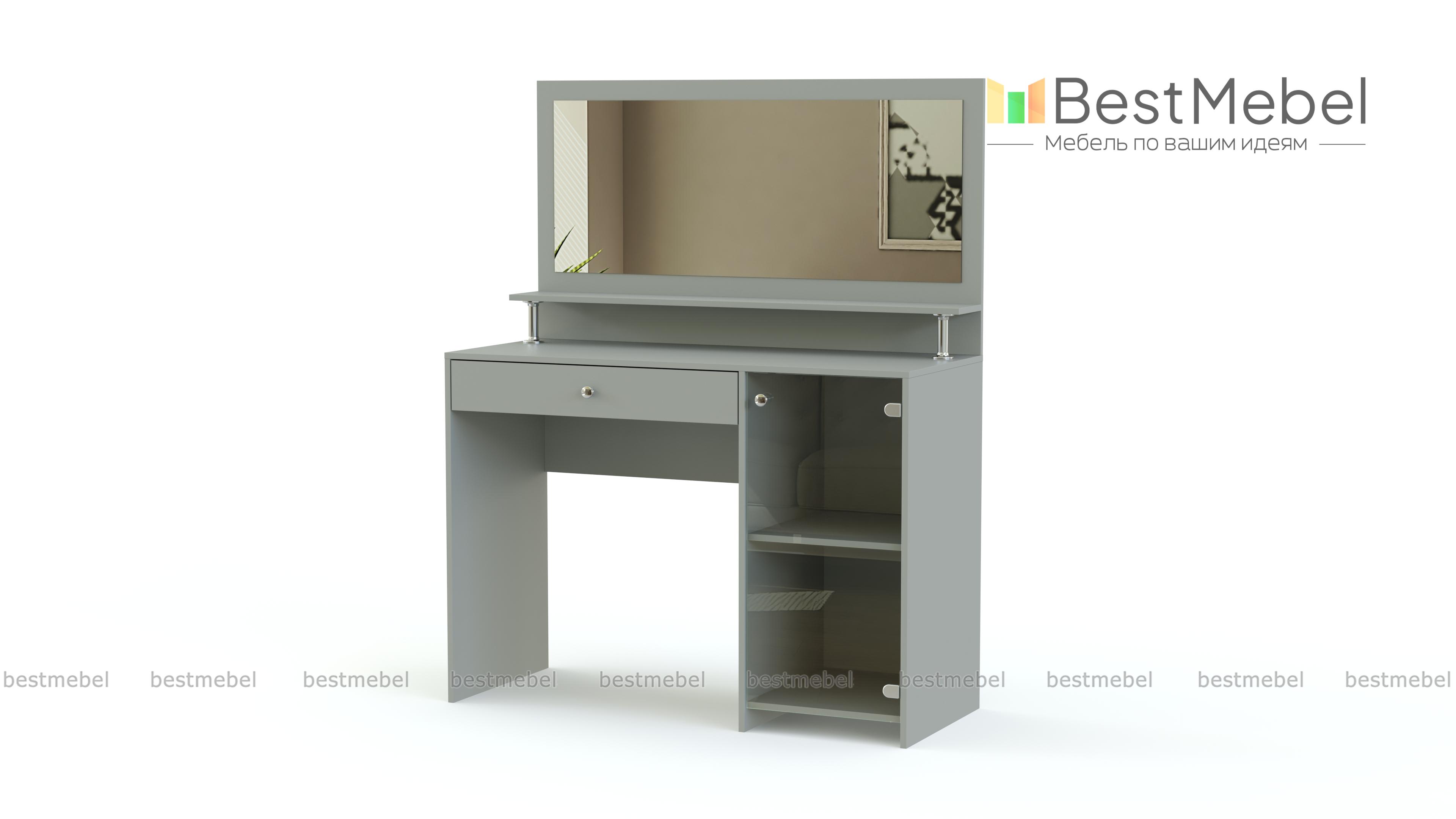 Очень симпатичная, стильная и удобная модель станет настоящим подарком для каждой женщины. Туалетный набор Тет-А-Тет Премиум BMS довольно вместительный. Он имеет специальное место под большое зеркало, под зеркалом расположена элегантная полочка для парфюмерии на хромированных подставках. Кроме этого есть большая тумба с полкой и выдвижной ящичек под столешницей. Все это дает возможность удобно расположить массу личных вещичек. У нас Вы можете не только заказать туалетный набор Тет-А-Тет Премиум BMS нужного Вам цвета, но и указать требуемые Вам размеры.