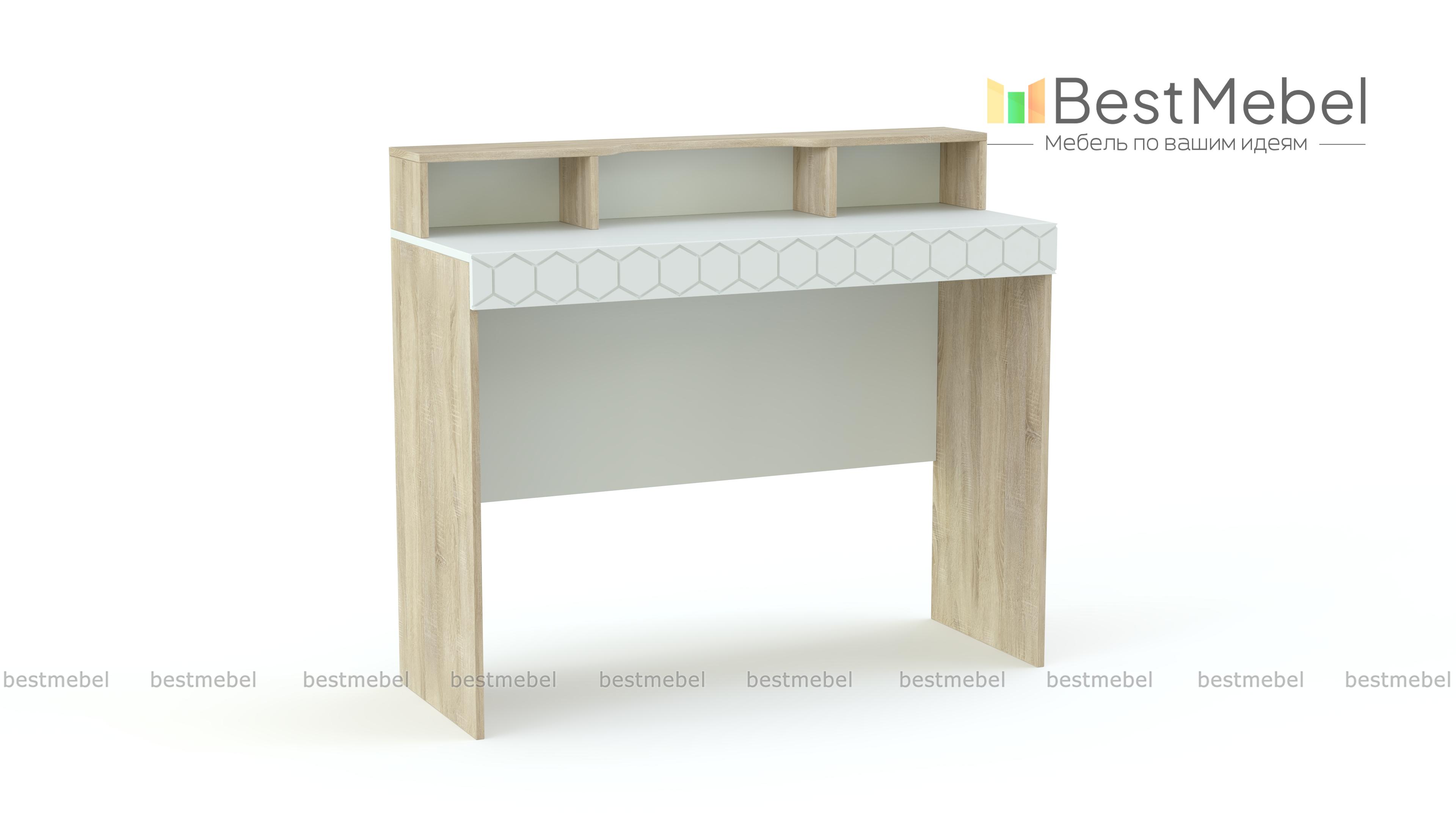 Туалетный стол Монте 5 BMS выполнен в древесных тонах теплой светлой гаммы и декорирован по фасаду накладкой с оригинальным фрезерованным орнаментом. Для удобного хранения мелочей элегантный столик оборудован широкой двухуровневой столешницей с полочкой, к которой крепится зеркало, и вместительными нишами. Износостойкость поверхностей и простота ухода помогут надолго сохранить модели эстетичный вид. Купить туалетный стол Монте 5 BMS и сделать спальный интерьер функциональнее вам поможет наш интернет-магазин.