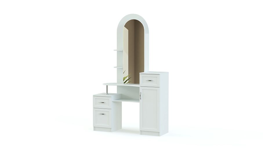 Классическое трюмо оригинального дизайна Камелия BMS подойдет для оформления классических спален и гостиных. Благодаря конструкции, модель не только привлекательна внешне, но и на редкость функциональна. Перед большим зеркалом в полный рост можно не только делать макияж, но примерить одежду, а откинув зеркальную дверцу, вы найдете несколько полок для мелочей. Интересно расположение небольшой тумбы и комода, а металлическая фурнитура и асимметричные линии столешницы смотрятся особенно необычно.