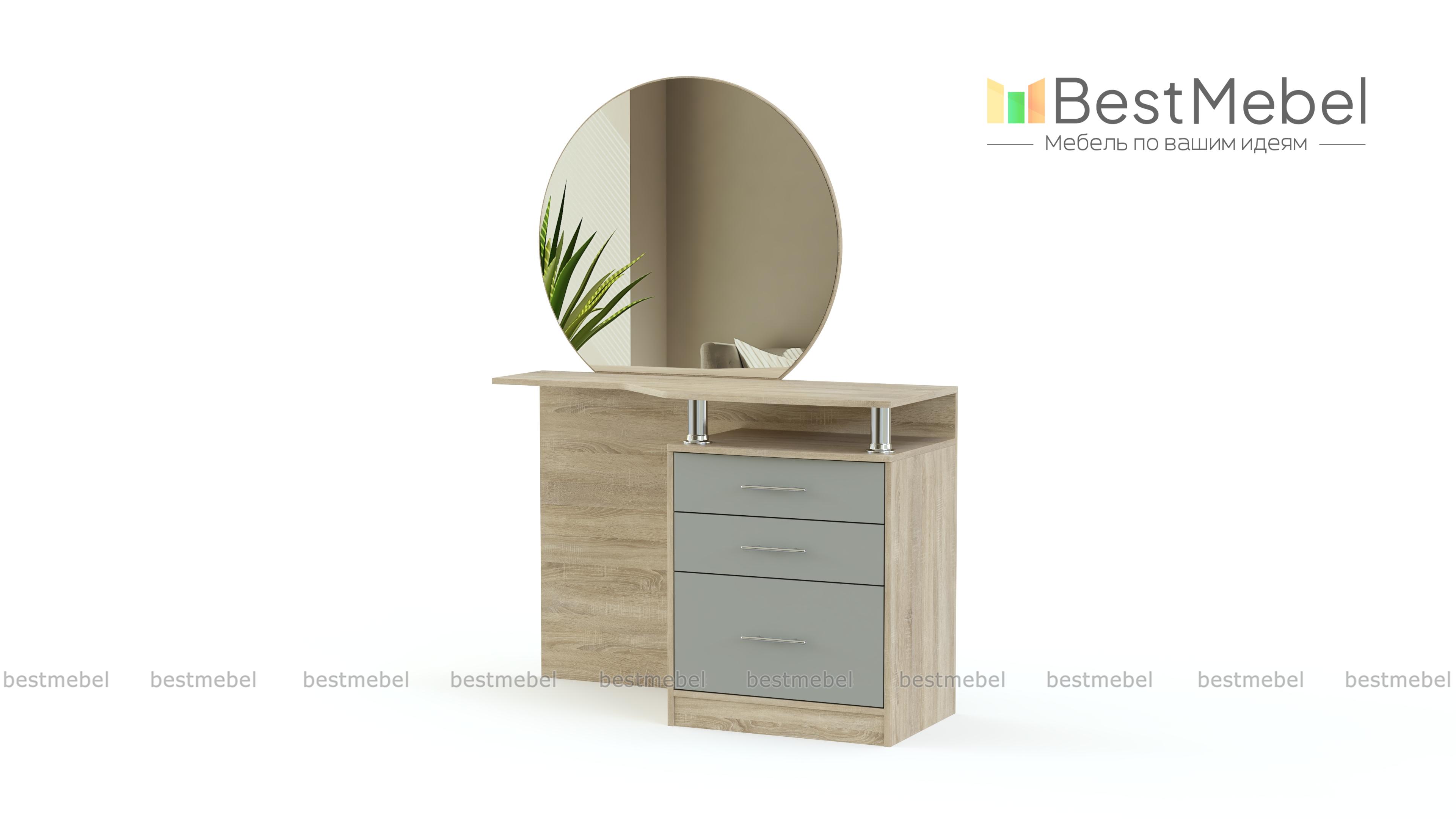 Одна из классических моделей, отлично вписывающихся в традиционные интерьеры. Круглое зеркало закреплено на широкой, удобно вырезанной столешнице, где достаточно места для косметики и парфюма. Для хранения мелочей предназначены и выдвижные ящики боковой тумбы. Туалетный столик Венеция BMS выполняется в спокойных сдержанных цветах, просто декорирован и придаст вашей комнате уют и легкий оттенок ретро. Порадует он и доступной на нашем сайте ценой.
