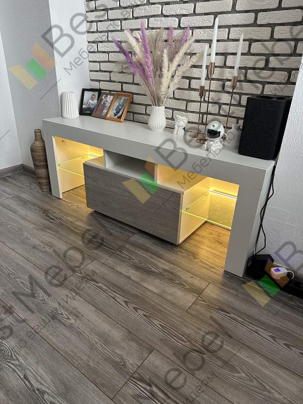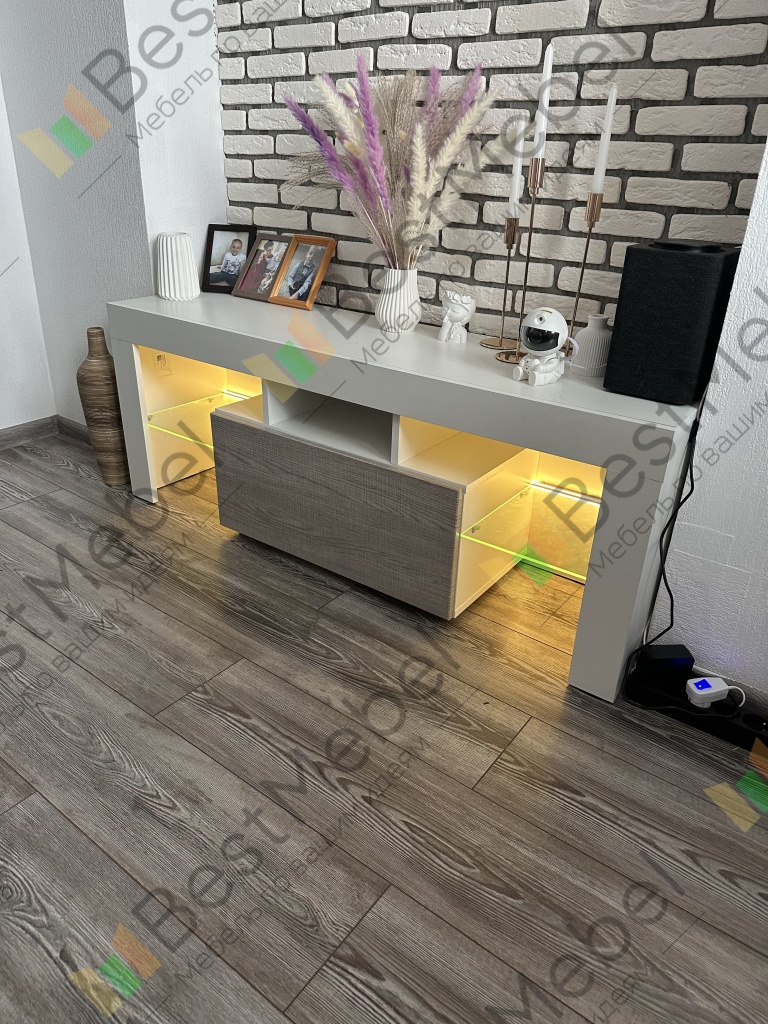 Компактные размеры, современный дизайн и доступная цена делают модель RTV 130 BMS особенно популярной. Тумба выполнена в универсальном сочетании белого матового корпуса и глянцевого фасада – светлого или темного на выбор. Функциональная модель оборудована просторной столешницей, открытыми полками со светодиодным освещением и выдвижным вместительным ящиком. Телевизор, другая техника, предметы декора и многочисленные мелочи будут размещены в вашей гостиной оптимальным образом.
