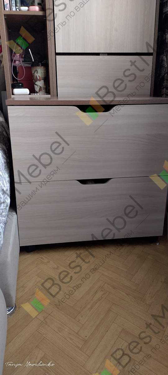 Я обратилась в магазин BESTMEBELSHOP, потому, что мне понадобилась тумбочка по моим размерам. На сайте я выбрала из дешевых 2 штуки и изменила их размер. На фото видно, какая была тумбочки "Либерти" до изменений. Я значительно увеличила размер. Цена при этом не увеличилась намного. Далее, в разговоре с менеджером я попросила убрать пространство между полом и дном, то есть опустить ее на пол и утопить ящики. Он нарисовал эскиз оперативно. Жаль, забыла его имя: очень понятливый парень! Таких тумбочек я заказала 2 одинаковые .Заказ 00000563401, изделие ЭСКИЗ №00000563401 Тумба прикроватная Либерти ТД-297.03.02 BMS (651х451х645)Ждала я 2 или 3 недели( было некритично), но в срок мне позвонили из доставки. Я не знаю конкретно, откуда их везли. Договорились на поздний вечер, но в результате уже утром их привезли. НО за то, что опоздали, не взяли деньги за занос в квартиру. Спасибо ребятам, видно, что уставшие.Сборка была качественная: все детали на месте, разметка совпала, все обозначены наклейками. ( потом эти наклейки размачивала тряпкой, чтобы оторвать)Я довольна такой четкостью исполнения. Грамотно все сделали. Особенно мепеджер.