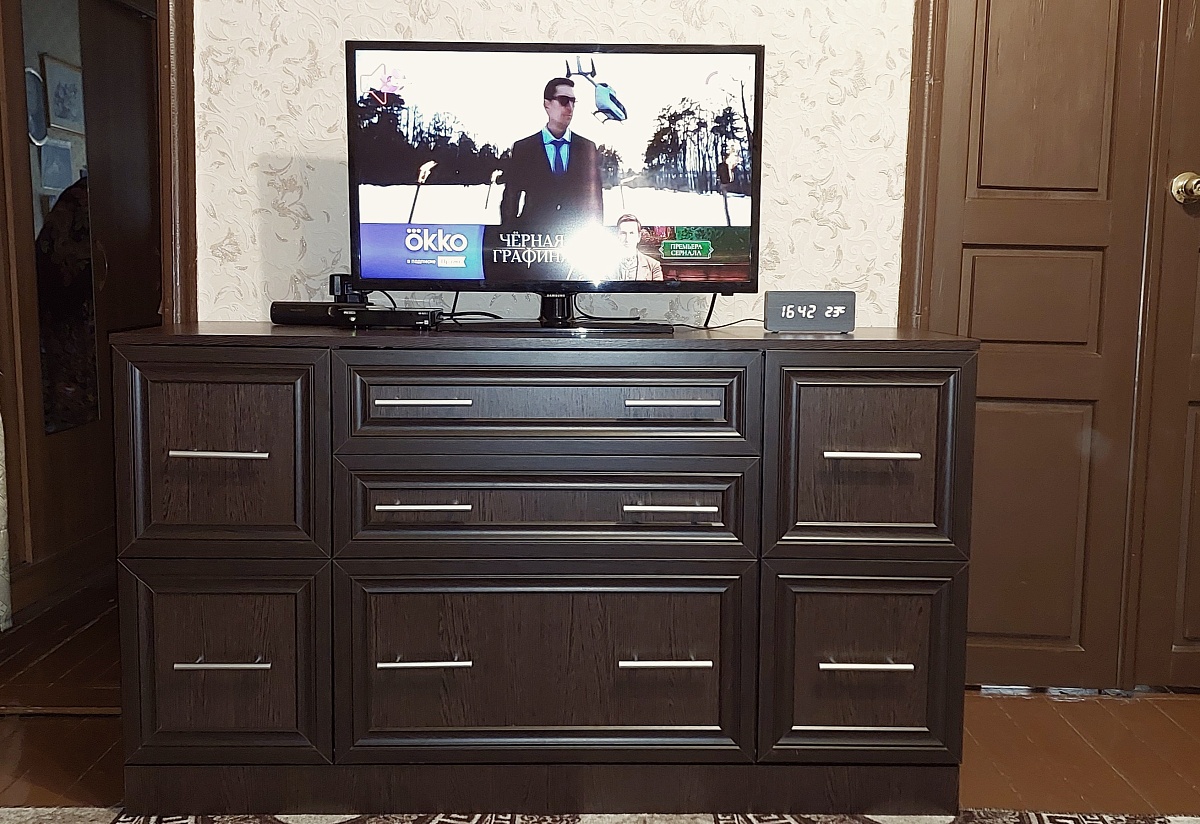 Комод Иван 2.4,2 ящика BMS. Заказ № 00000295853. Размер нестандартный 1600х1200х500.Удобный интерфейс для заказа, большой выбор фурнитуры, материалов и цветов.Запросил эскиз комода, для понимания глубины ящиков, направили в тот же день, что очень помогло.Высокое качество материалов, не жалею, что выбрал достаточно дорогие направляющие для выдвижных ящиков- работают легко, без шума и перекосов, то же по петлям дверей.Привезли вовремя, сборщик работал достаточно долго, но качественно.По результатам эксплуатации в течение 2-х месяцев недостатков нет.Покупкой и магазином очень доволен.Рекомендую!
