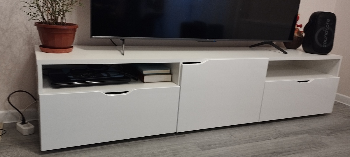 Заказ 1104688, тумба под телевизор.Спасибо, отличная тумба, хорошо вписалась в гостиную. Заказывала под свои размеры - спасибо интернет-магазину, очень удобная навигация.Единственное пожелание - доработать выпилы вместо ручек - слишком мелкие, приходится подхватывать ящик или дверцу ногтями, поэтому снимаю одну звезду.В остальном всё отлично - детали подогнаны хорошо, нигде никаких перекосов или выступов.