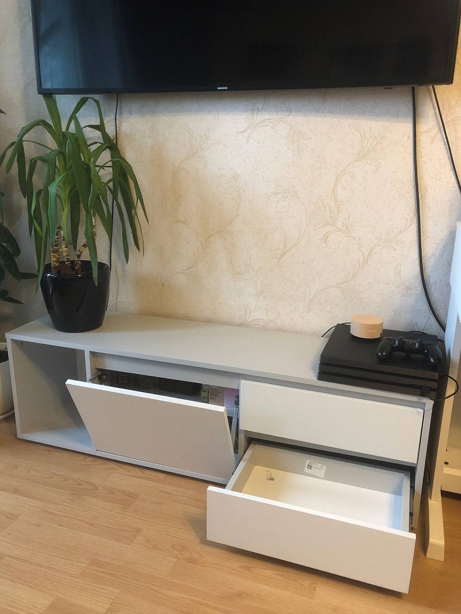 Тумба классная! Переживала, что маленькая (1300х400х330), но оказалась вместительная! Смотрится стильно, аккуратно! Пыль не видна, что немало важно)) Рекомендую!