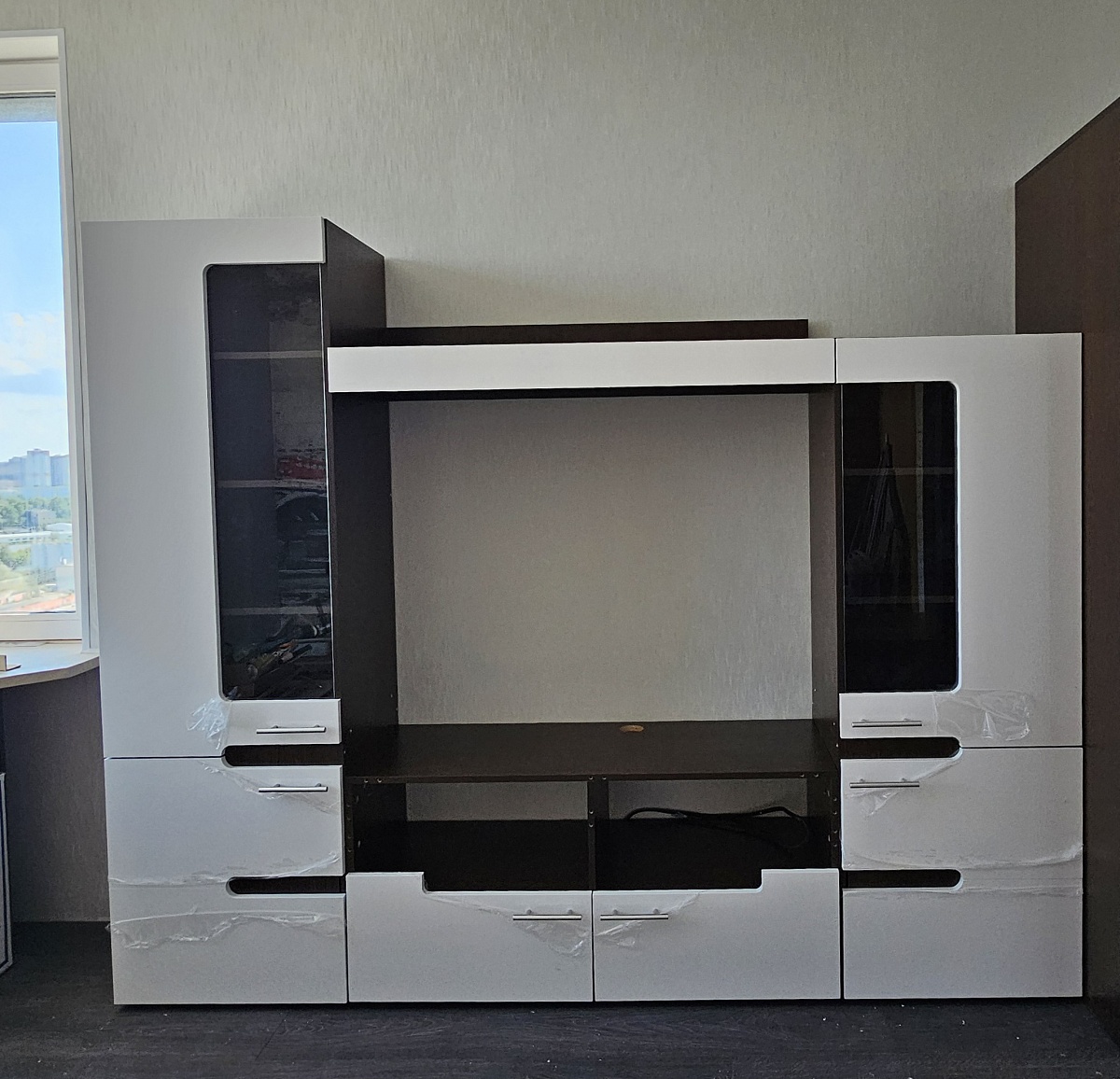 Стенка смотрится очень современно, идеально сочетается с кроватью и тумбами из этой же серии. Хотелось бы повыше шкафы и открывающуюся дверку под тв-тумбой, иначе пропадает место.