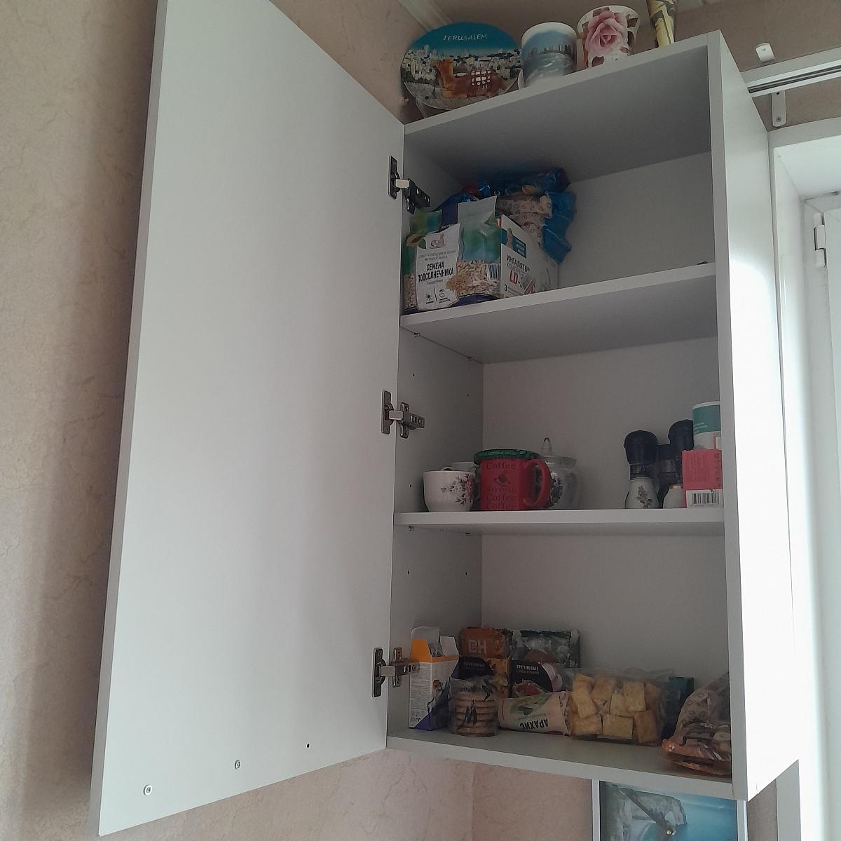 Заказ 00000733130. Заказал высокий и широкий шкаф, чтобы занять пустое место между навесными шкафами на кухне. Благодаря возможности выбора необходимого размера, получил именно то, что хотел. Фурнитура, материал фасада и корпуса качественные, цвет чистый, ровный. Заказа дополнительную полку, чтобы увеличить вместимость. Благодаря двум дверцам и петлям с доводчиком открывается и закрывается шкаф легко. Все в комплекте, доставили все быстро и в сохранности.