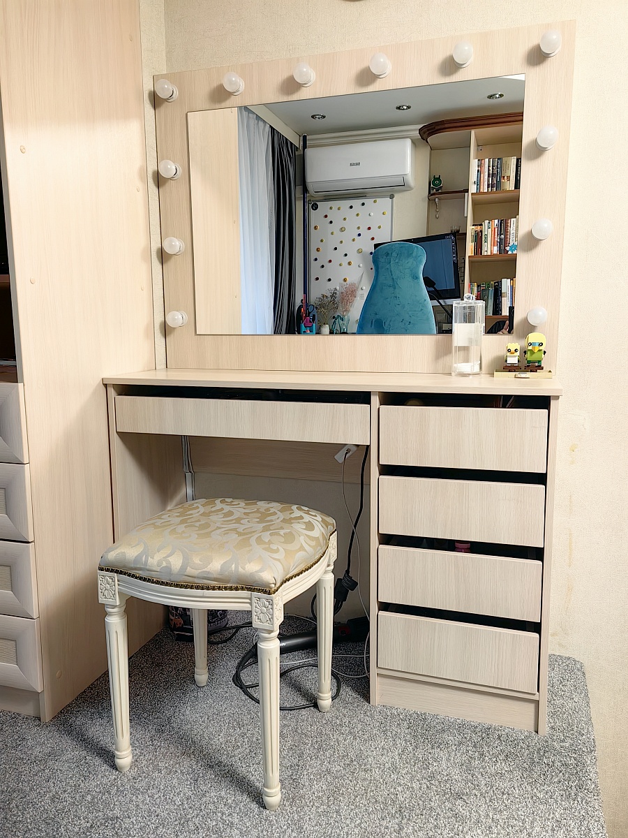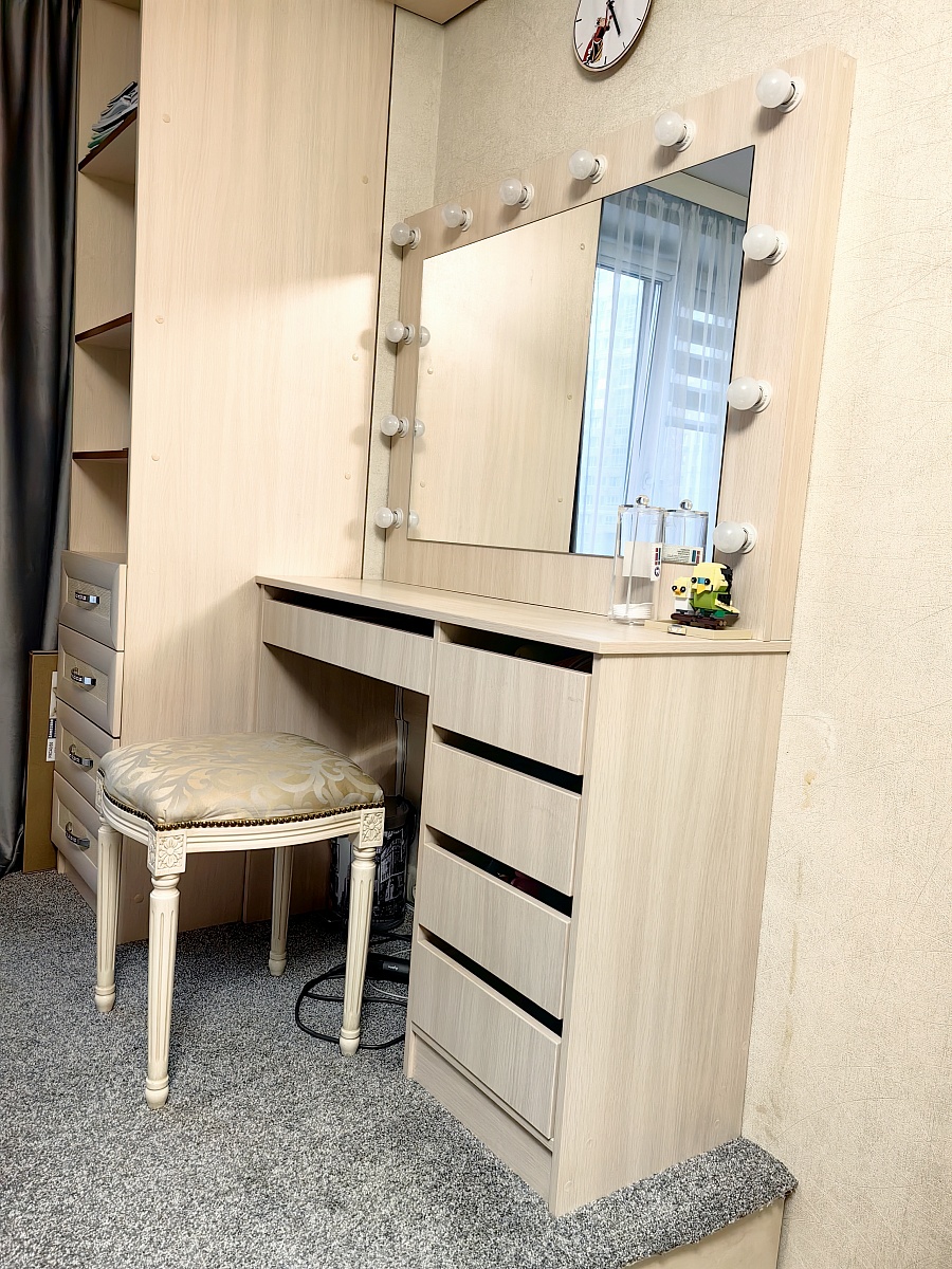 Заказ ‪00000710074‬ Столик удобный и полностью соответствует ожиданиям (заказывали через интернет). Собирал сам, немного пришлось повозиться , но и инструкция  и всё что нужно было ( я бы добавил гвоздиком для крепления дна у ящичков). В части дизайна я бы сделал закрытыми ящики с ручками, чтобы пыль не залетала.  Но это моё мнение. На фото я немного изменил концепцию и убрал полку от зеркала, а зеркало поставил на стол. Нам так больше понравилось.