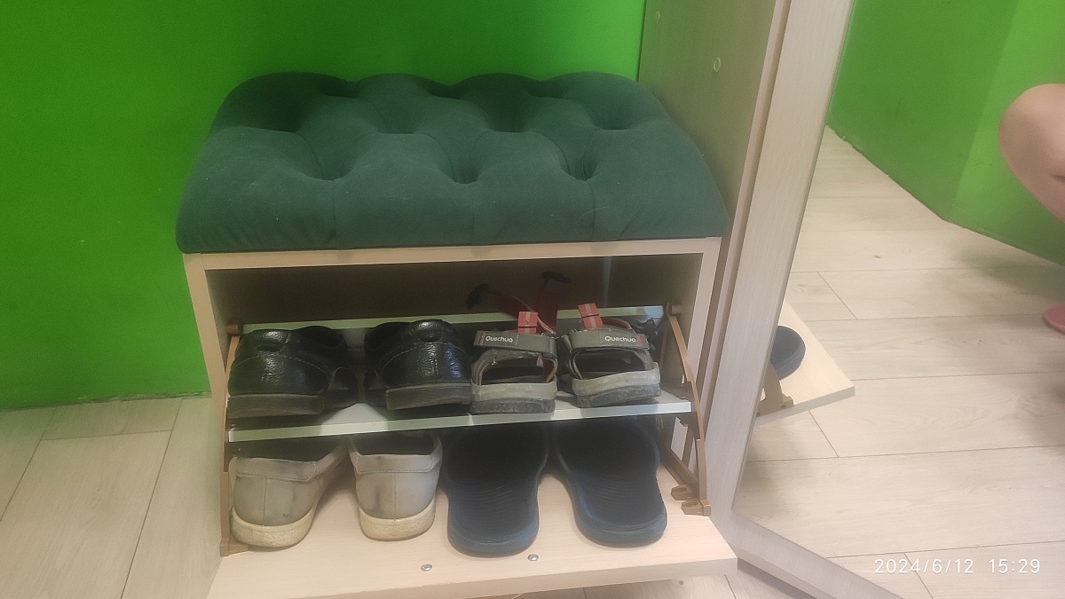 Номер заказа 00000691648  тумба оказалась очень удобной. По моей просьбе её сделали немножко уже, чем было заявлено в стандартных размерах абсолютно бесплатно. Тумба очень надёжная, намного удобнее, чем узкие тумбы. В эту тумбу нормально влезает обувь 43 размера. Ну единственное, что на велюр очень хорошо прилипает кошачья шерсть. Но к когтям устойчиво.