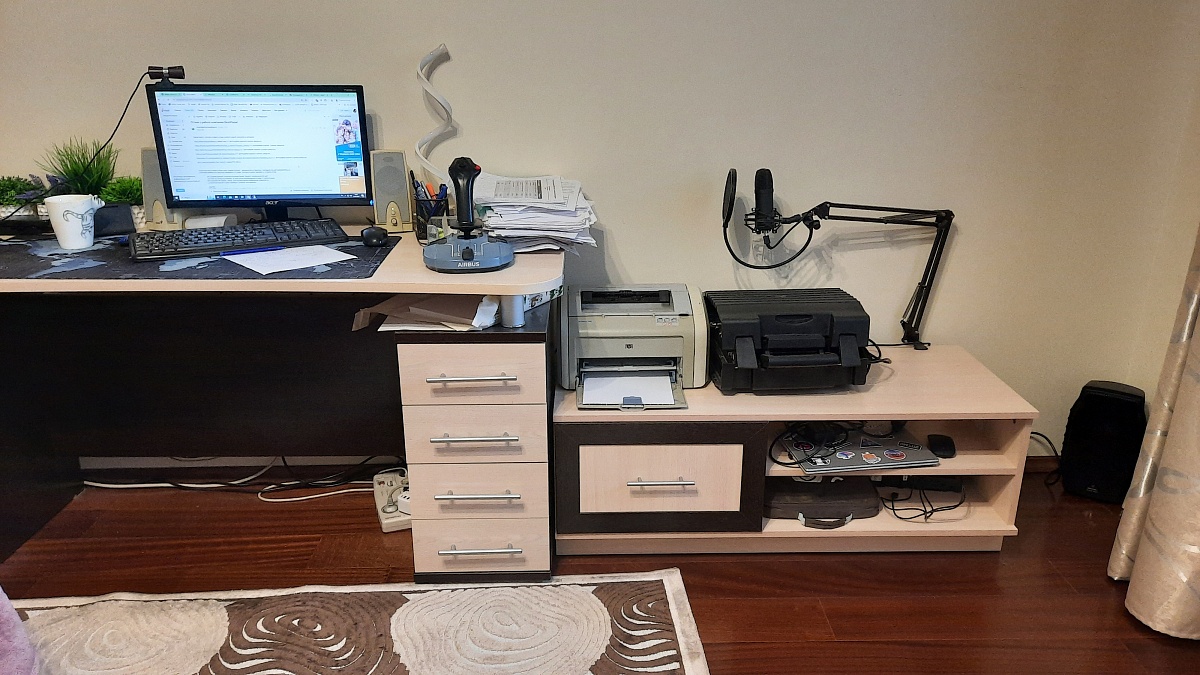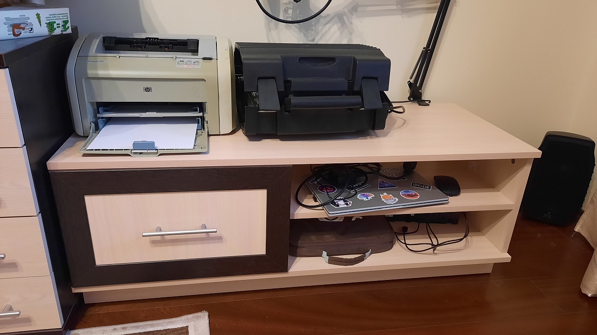 Искали тумбочку под принтер и другую технику в нашу комнату-кабинет. Компьютерный стол был ранее куплен в другом магазине, и требовалось подобрать что-то близкое по стилю и расцветке. За счет того, что для данной тумбы можно самостоятельно выбрать цвет отделки и фурнитуру, она очень хорошо вписалась и "подружилась" со столом. Также очень удобно, что размеры  можно заказать произвольные.