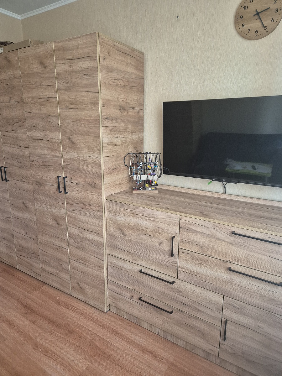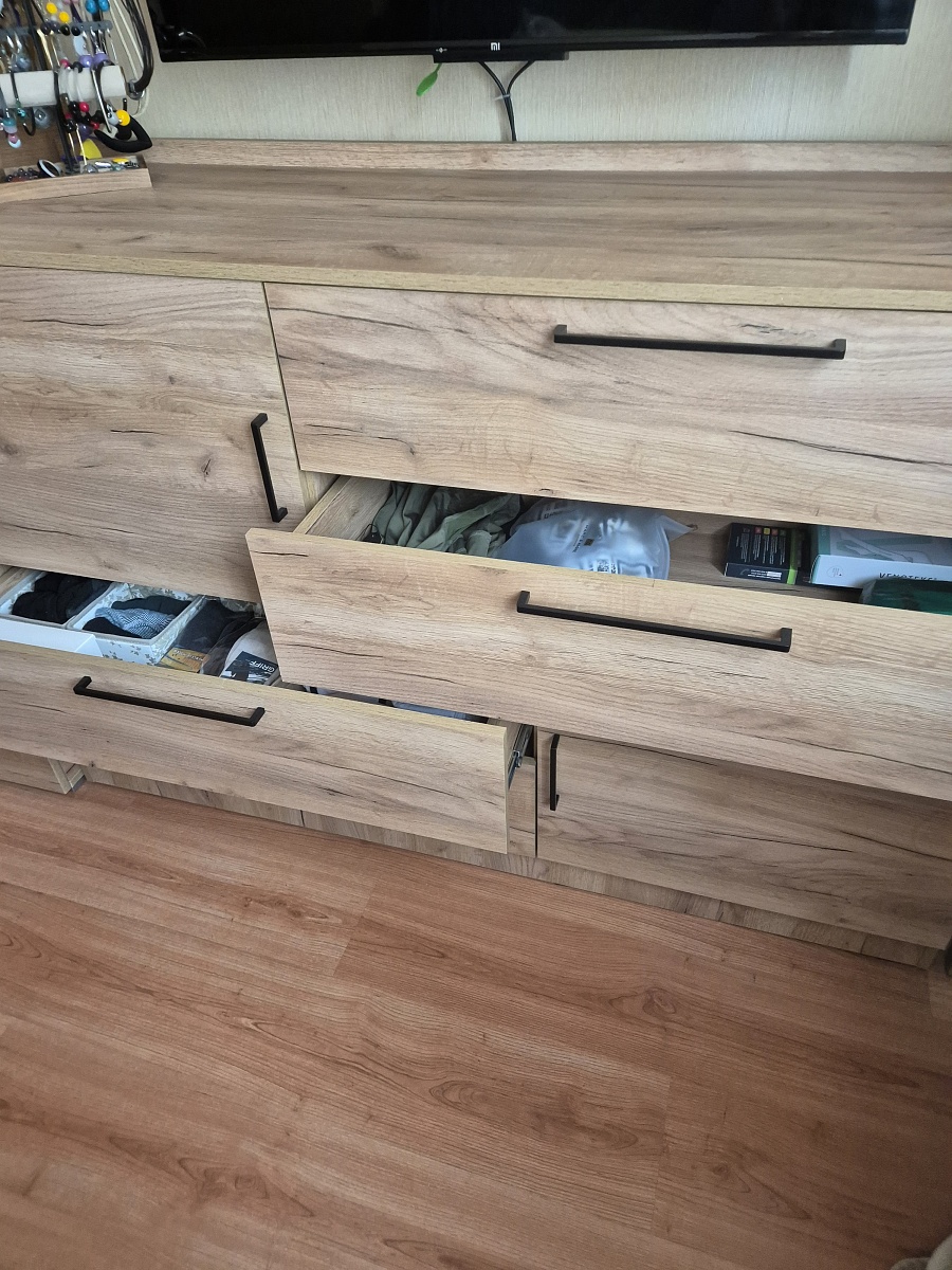 Заказ 00000694204, изделие ЭСКИЗ №00000694204 Комод Нордли Nordli 11 (1500х990х470)Были куплены изначально шкафы - цвет золотой дуб крафт у другого производителя. На разных сайтах искала возможность изготовить комод такого же цвета по своим размерам (стоимость получалась дороже, чем я отдала за шкафы )). Случайно наткнулась на бестмебель. Выбрала цвет, свой размер и то, что хочу. Т.к. основной критерий- ящики для нижнего белья и полки для хранения постельного белья и подушек. Единственное, что докупила отдельно - ручки. Т.к. у шкафов уже ручки были. Привезли всё в срок, мой папа собрал его. Я очень довольна .