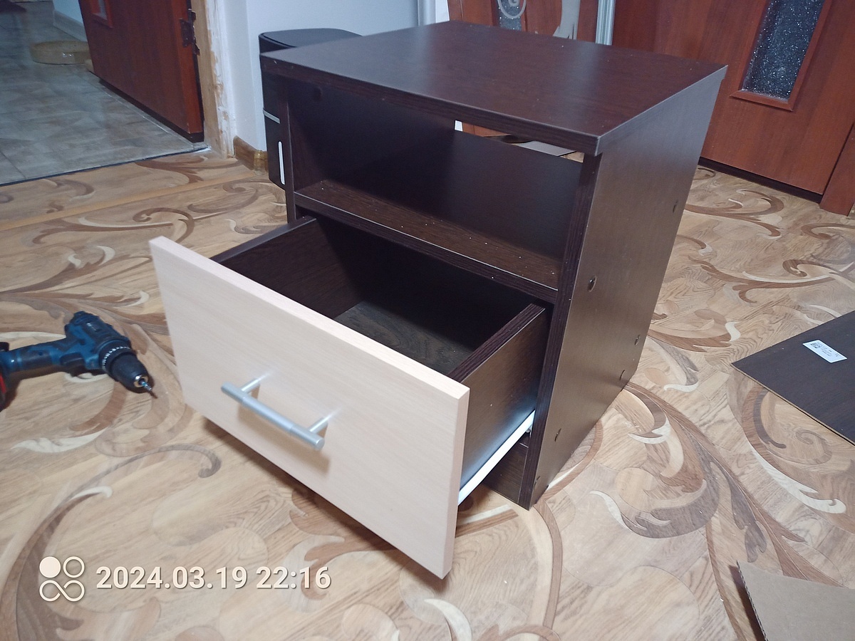 Заказ 00000638094, изделие ЭСКИЗ №00000638094 Колонка Млайн 2 BMS (450х2000х430)Заказывал колонку в феврале. Первый раз пользовался услугами этой фирмы, поэтому обо всём подробно. Плюсы и минусы будут идти вперемешку.Что понравилось, так это возможность при заказе настроить всё под себя - размеры, цвет каркаса, кол-во полок, срез под плинтус, фурнитуру, цвет стекла - всё можно править онлайн. Если бы я ещё заметил, что заднюю стенку из двп можно также утопить внутрь каркаса, то сделал бы и это, но, увы, оказался невнимательным. В итоге сделали всё точно по размерам. Но! Хотелось бы, конечно, побольше примеров фото различных цветов, что предлагаются на сайте - лучше в хорошем разрешении, а то ожидание и реальность могут не совпасть в итоге, когда изделие уже привезут на квартиру - у меня был цвет графит и ещё какой-то серый уголь, поэтому более менее всё сошлось, но я всё равно гуглил картинки, как этот серый уголь выглядит вообще - картинка на самом сайте на мой взгляд реальность не отображает.Также мне понравилось общение с менеджером. К сожалению, забыл как её зовут, но девушка была приветливая, ответила на все мои вопросы. Их было достаточно, так как я заказывал на этом сайте впервые и не знал, чего ждать. Посчитали вместе высоту полок и это привело к тому, что я решил добавить ещё одну. В общем, всё прошло довольно гладко. Дозвониться не составило проблем и вообще перезванивают быстро.Теперь минус - это время изготовления. В итоге за несколько дней до назначенной даты, мне позвонили и сказали, что придётся подождать ещё дней десять, так как нет одного из цветов (того самого "серый уголь"), что я указал в заказе. Такие моменты неприятны, но пришлось подождать.Доставка ничем особенным не отличалась - принесли тяжёлую коробку, занесли в квартиру - чуть было не забыли забрать деньги за заказ, пока я не настоял на этом) Оплата, кстати, по факту. Авансов никаких не было, что честно сказать, удивительно. Но и сумма у меня не ахти большая была, около 21 тысячи.Собирал сам. И тут, конечно, у меня большие претензии к инструкции - она представляет собой сборочный чертёж и помещается на одной стороне А4 листа, по сути этот же чертёж вы можете увидеть на сайте в фотографиях товара. Интересно, что это, что называет, типовая инструкция, как будто вы купили конфигурацию по умолчанию с сайта, то есть никаких дополнительные полки там не указаны и вообще размеры не указаны. Не знаю, может это обусловлено вариативностью возможной комплектации. Ну и нарисовано так, что над некоторыми местами приходится подумать, а вернее собирать приходится по интуиции. В итоге после сборки у меня осталось приличное кол-во крепежа, для которого я не нашёл никакого применения. Также на одной из боковых панелей часть дырок была заклеена на торце (см фото). Я уж было подумал - забыли просверлить, стал отдирать покрытие - и вуаля - под ним оказались нужные дырочки. Чувствуется, немножко колзох, если честно. А ещё, когда осталось только повесить дверь, и я радостно поднял её из коробки - под ней оказался такого же размера панель дсп цвета графит. По началу я немного запаниковал - как я мог забыть поставить такую большую деталь?! - но выяснилось, что на ней нет маркировки и вообще на инструкции её нет - так что это, видимо, запасное что-то или для жёсткости - не знаю. Так и стоит теперь у меня на балконе, сомневаясь в смысле свое