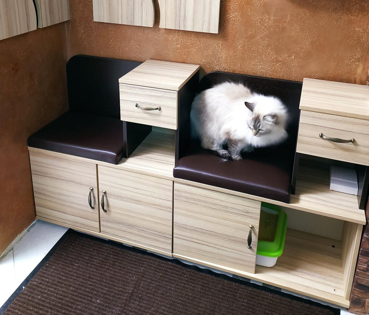 Тумбы очень здорово подошли в наш миниатюрный коридор. Одну тумбочку выделили под кошачий туалет (дверцу и полочки в ней не стали устанавливать просто). Очень эстетично получилось, туалет не виден практически и не мешает никому.  Вторая тумбочка используется по назначению Возможно надо было заказать их зеркальными, но догадались уже потом. Но так тоже нормально, не критично.