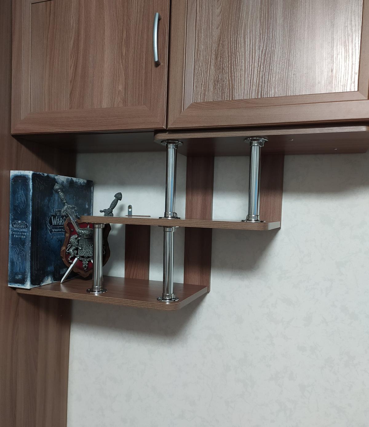 У нас две такие полочки симметричные (на фото одна из них). Приобретались к уже имеющейся гостиной стенке. По цвету 100% попадание. Очень интересно они смотрятся. Легко собрались. Все дырочки были на правильных местах, есть инструкция и все детали подписаны. Все отлично!