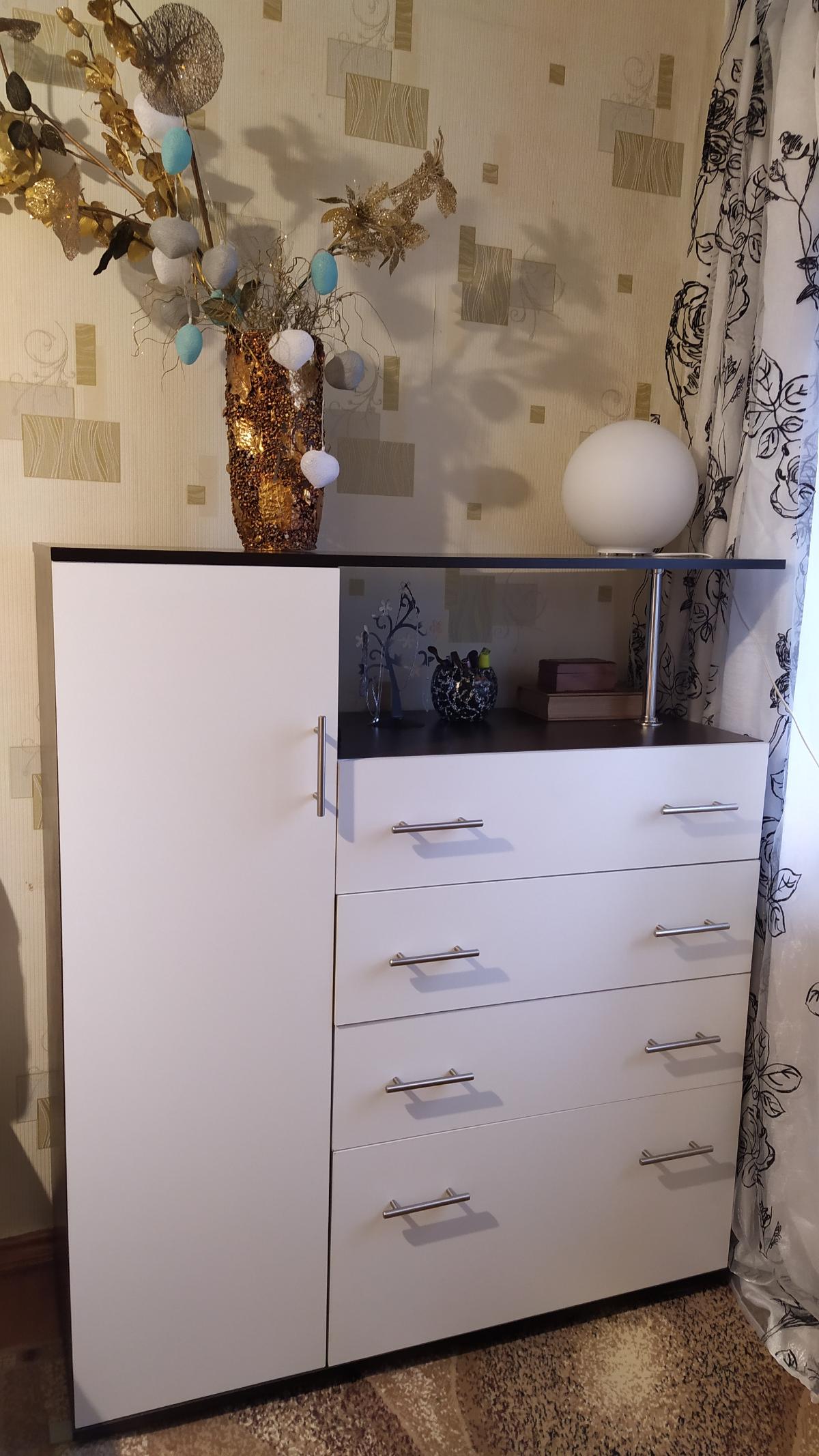 Покупала этот комод почти год назад. Большой плюс, что при выборе можно самому выбрать цвет, фурнитуру, материал по своему желанию и предпочтениям. Комод очень понравился, служит исправно уже почти год - нареканий нет. Собирали сами по схеме, пришлось повозиться, но результат порадовал. Совет - не экономьте сразу на фурнитуре, от нее зависит многое. В целом - рекомендую к покупке.