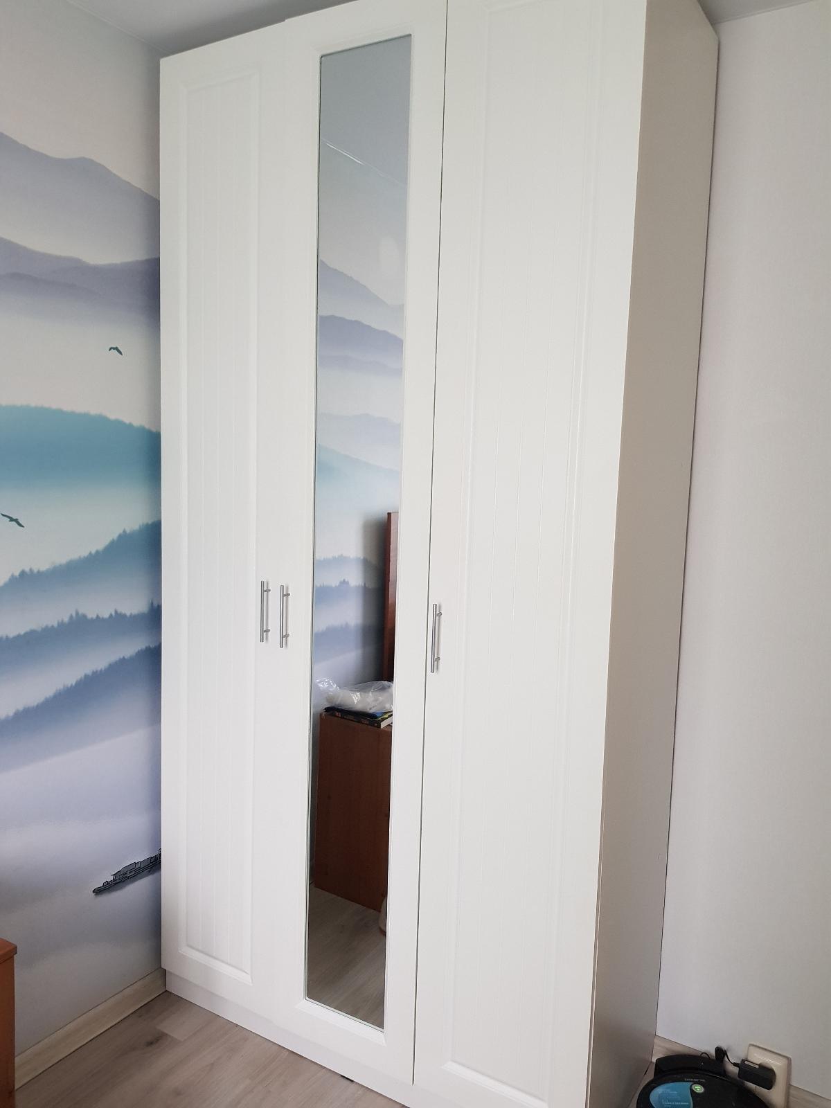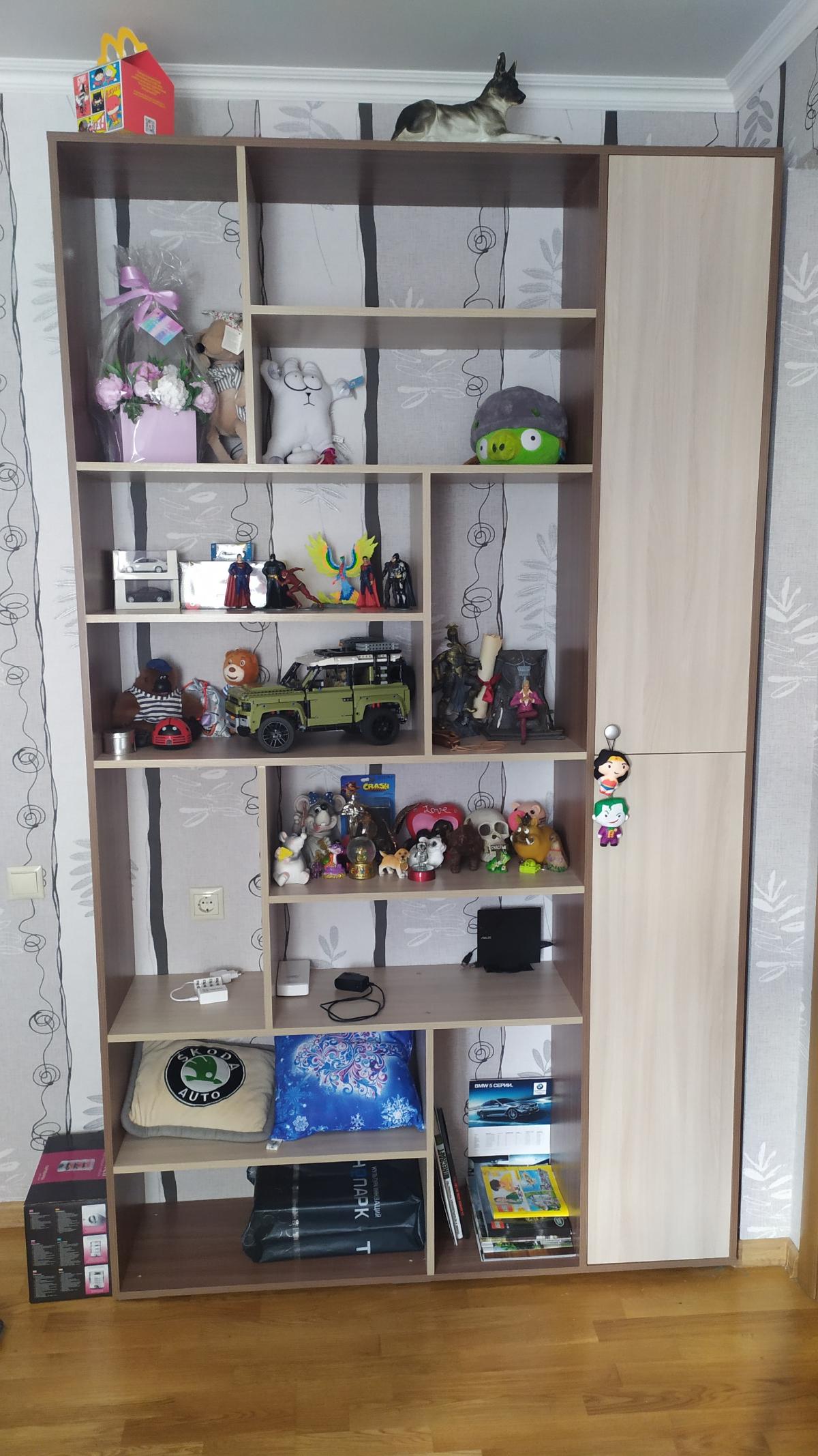 Купил стеллаж в маленькую комнату под всякую всячину, размер выбрал 2400*1400*330. Привезли вовремя, все в комплекте, всего хватило, собрал сам. Петли с доводчиком мягко закрывают, ножки регулируются по высоте. В комплекте 4 уголка для крепления к стене. Из минусов могу выделить что маскировочные наклейки для конфирматов не попадают в цвет. В целом доволен