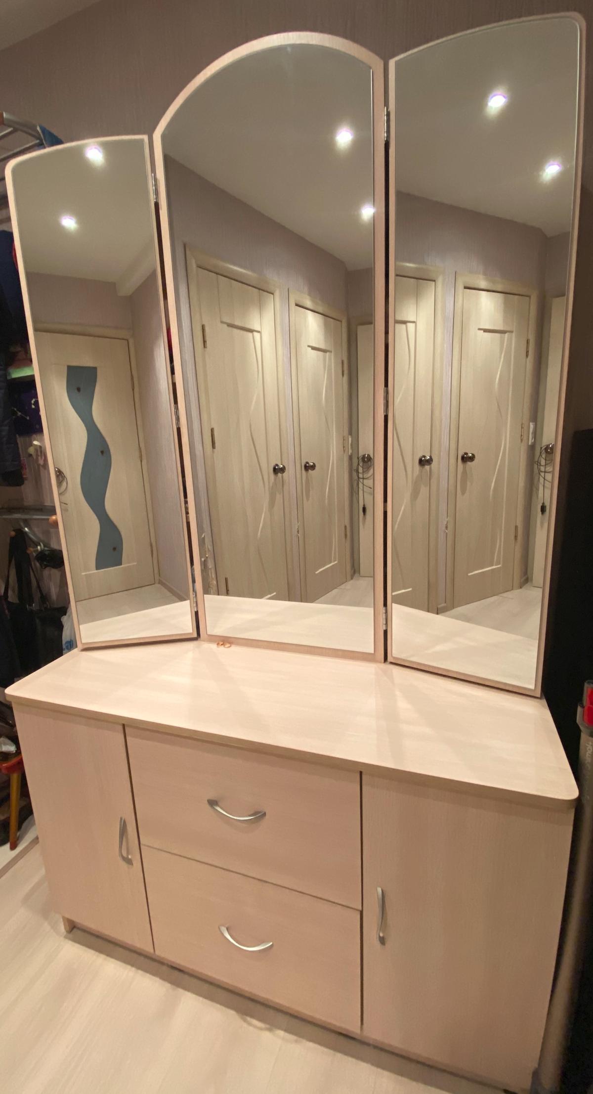 На самом деле очень страшно было приобретать мебель по интернету, не видя объект вживую (покупали через интернет-магазин), но надо отметить, что в результате Трельяж полностью соответствовал размещенной фотографии в магазине. Даже обнаружились дополнительные магнитики на зеркальных створках - очень удобно, чтобы не распахивались в ненужный момент. Размеры и цвет при заказе скорректировали под свои (такая опция в магазине есть). Получилось то что надо!Оформление - сразу перезвонили для подтверждения, условия все проговорили.Доставка - вовремя, как и обещалось. Привезли, пересчитали упаковки.Зеркало целое, панели без сколов. При сборке всех деталей было достаточно. Никаких перекосов, все детали прочно скреплены.Хорошая корпусная мебель.