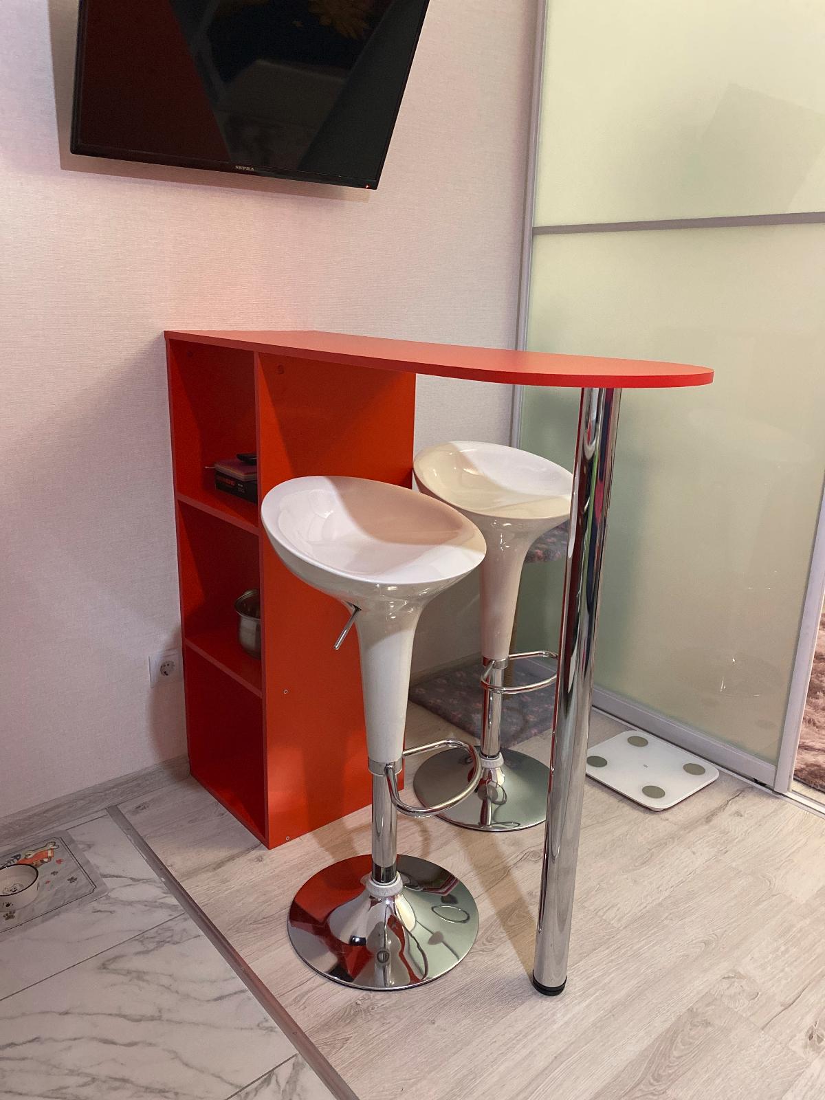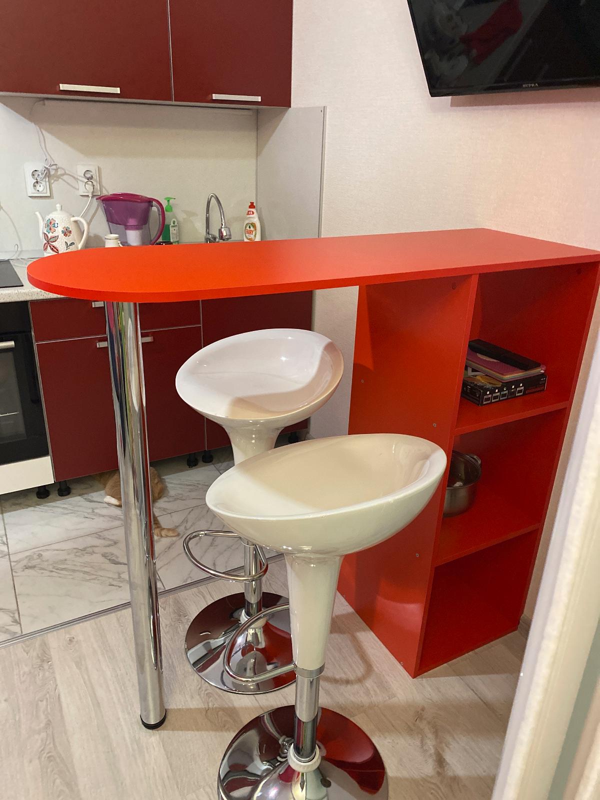 Очень довольна барной стойкой! В квартире-студии лучше и не придумать! Выполняет функцию обеденного стола и рабочего. Понравилось, что можно выбрать товар практически в любом цветовом исполнении. Полочки-приятный бонус.