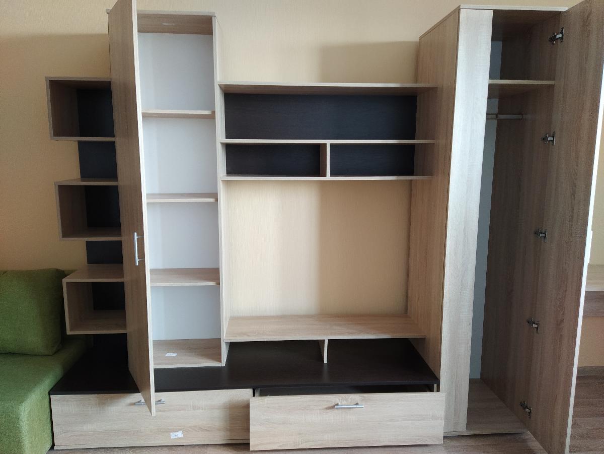 Хорошая небольшая стенка. Есть место и для одежды, и для книг,  и для разных мелочей. Большая ниша для телевизора. Имеется возможность изменить размеры и цвета. Доставка точно в срок, собирали самостоятельно. Никаких проблем. Приятно, что за каждый заказ на бонусный счет начисляются средства, которые можно использовать при оплате следующего заказа.