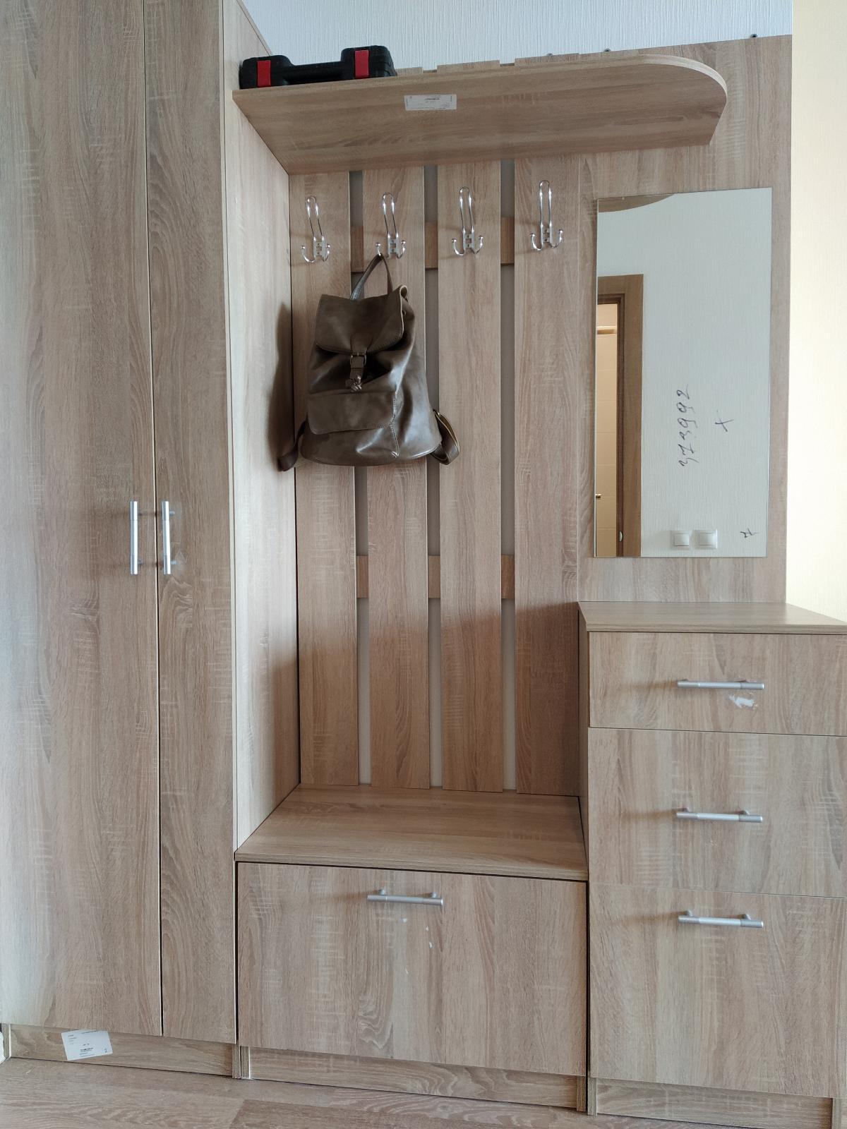 Удобная, компактная, но вместительная прихожая. Есть все, что нужно: закрытый шкаф для верхней одежды, которая пока не нужна, крючки для одежды, которую носишь постоянно, ящик для обуви, выдвижные ящики для всяких мелочей, зеркало... Удобно, что при заказе можно менять размеры. Прихожая вписалась в простенок идеально. Доставка была точно в срок, собирали самостоятельно, никаких проблем не возникло. Всем довольны.