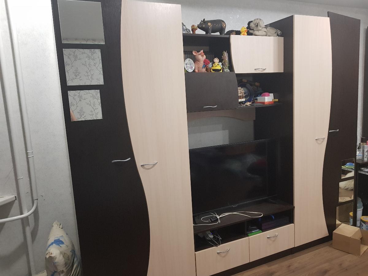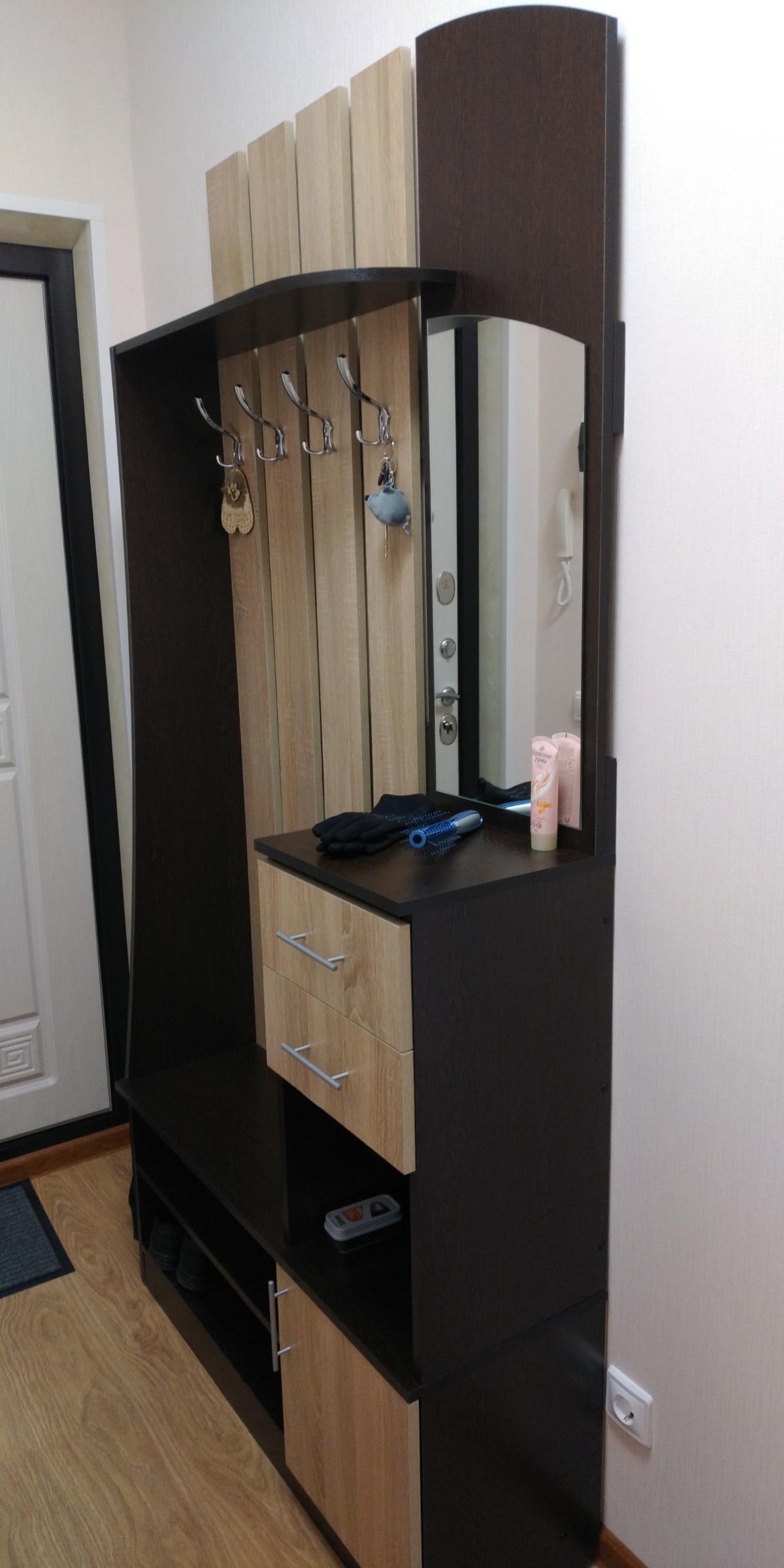Стенка очень симпатичная, в шкафы можно положить одежду, обувь или какие то предметы.  С одной стороны полки, с другой вешалка.