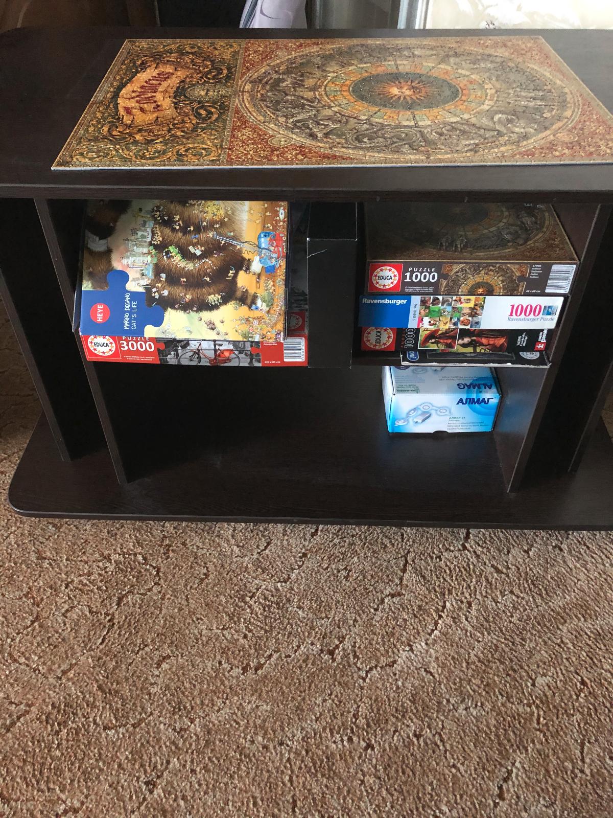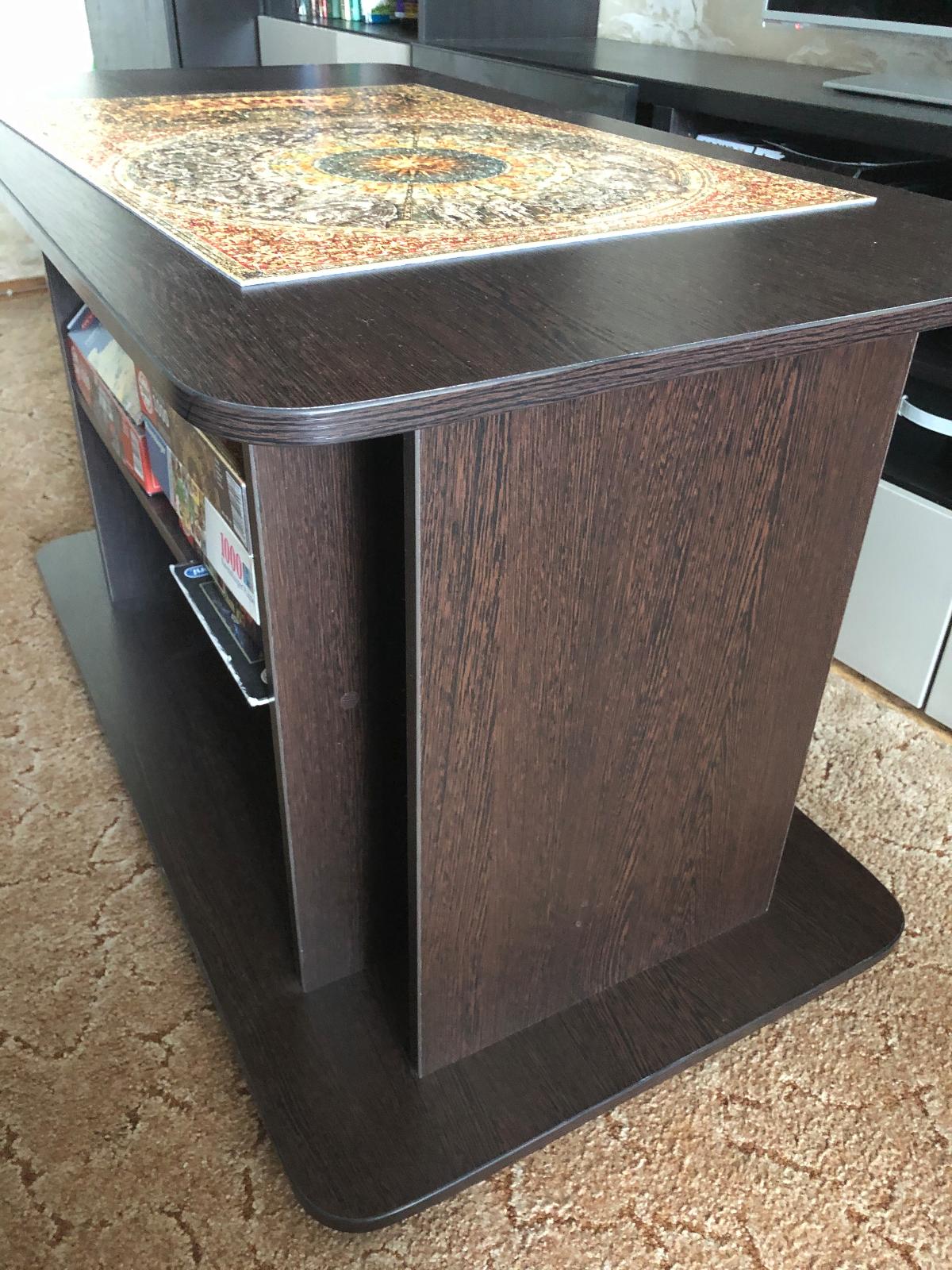 Я обожаю собирать пазлы!Мне было удобно это делать за журнальным столиком!Старый стол давно не соответствовал по размерам в перспективе «покорения» новых удивительных образов!Поэтому давно хотелось приобрести себе нового помощника!Этот стол бесподобен,во всех смыслах этого слова!Он большой!Очень нравятся закругленные края верха и низа!(Исключает вероятность травмирования)!Цвет(темный венге) идеален для мебели в комнате!Все в нем продуманно,в том числе универсальность: две горизонтальные широкие, вместительные полки, два вертикальных проема позволяют размещать        не стандартные картины, журналы...!Легко перемещается на достаточно надежных 5 ножках-колесиках!На нем можно по-быстрому собрать фуршет!!!Красота!Я очень довольна приобретением!Спасибо всем, кто принимал участие в создании этого классного,улобного,практичного журнального стола!!!