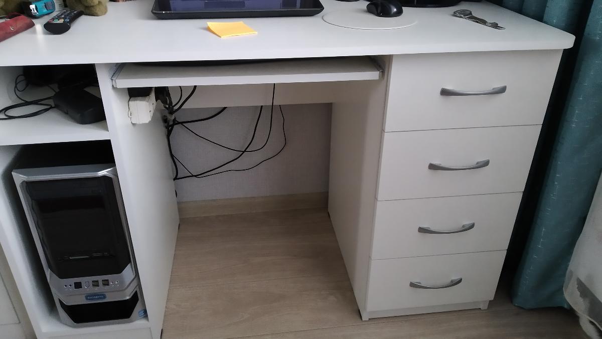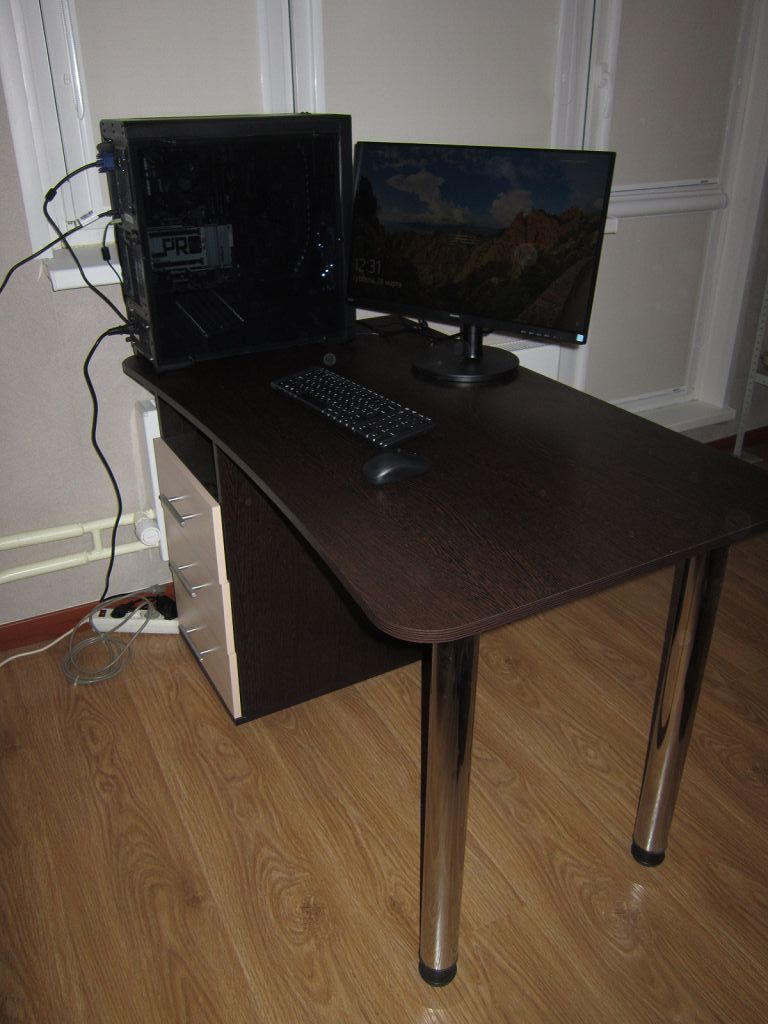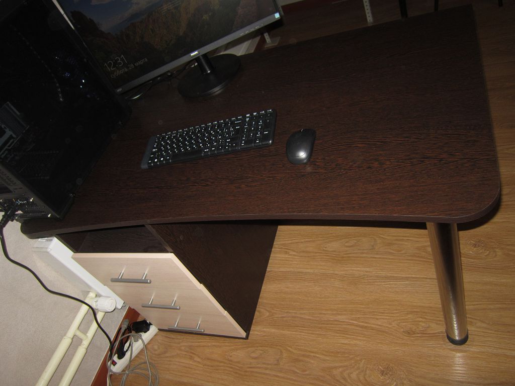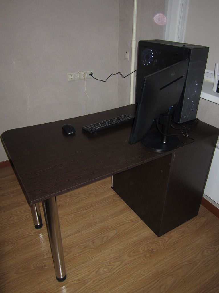 Отличный стол, за такие деньги - просто супер.Брал со стандартными размерами по всем габаритам (ШВГ 90х76х60). Сидеть удобно, даже если закинуть ногу на ногу.Не стал собирать полностью, так как мне это было не нужно, прикрутил только ножки (их в комплекте было 4, что просто прекрасно). По телефону попросил менеджера прорезать дырку для шнуров (см. фото) - сделали бесплатно. Ножки можно отрегулировать по высоте, чтобы стол не шатался даже на неровной поверхности. Единственный недостаток - кромка стола немного режет руки, так как острая, но планирую шлифануть, и проблемы не будет.Короче, все супер, спасибо большое!