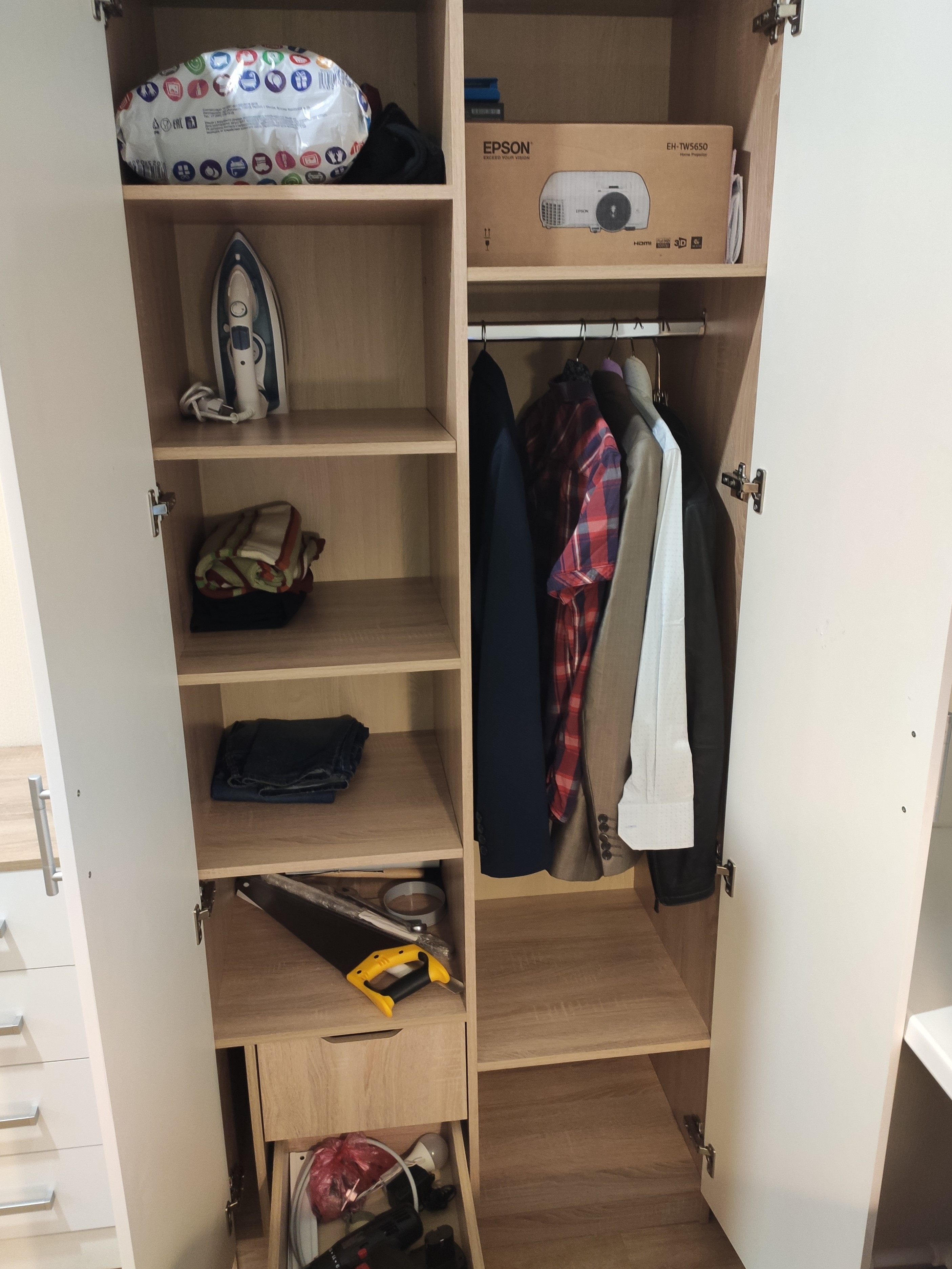 Очень долго искал навесной шкаф в нишу над кроватью, никак не мог найти подходящего варианта... Пока вдруг не осенило: а что если вместо навесного шкафа купить шкаф-купе, да и упереть в него кровать. Идея показалась гениальной. Во-первых, не надо будет бурить перфоратором дырки в капитальной стене, чтобы повесить навесной шкаф, что очень облегчает решение задачи. Во-вторых, вместимость шкафа-купе почти в 3 раза окажется больше навесного шкафа, что уже само по себе решающий аргумент. Сказано-сделано, залез в И-нет и почти сразу наткнулся на данный эконом-вариант шкафа-купе производства компании Bestmebelshop. Что называется, глаз на этот шкаф положил моментально. Во-первых, это просто-таки идеальный вариант для такой маленькой комнаты как у меня, во-вторых, порадовало неплохое соотношение цена-качество (дешевле похожих вариантов в И-нете не нашёл). Шкаф очень понравился! Очень вместительный! На нижние полки я положил хлам (старые журналы и газеты, освободив 2 отделения другого шкафа). Полки слева пойдут под бельё, полки справа под книги. Что особенно отрадно, на верхнюю полку помещаются 2 ряда по 3 в ряд боксов с СД- и ДВД-дисками.   В общем спасибо Bestmebelshop и мастеру Андрею из петербургского отдела Bestmebelshop, который мне этот шкаф собрал.