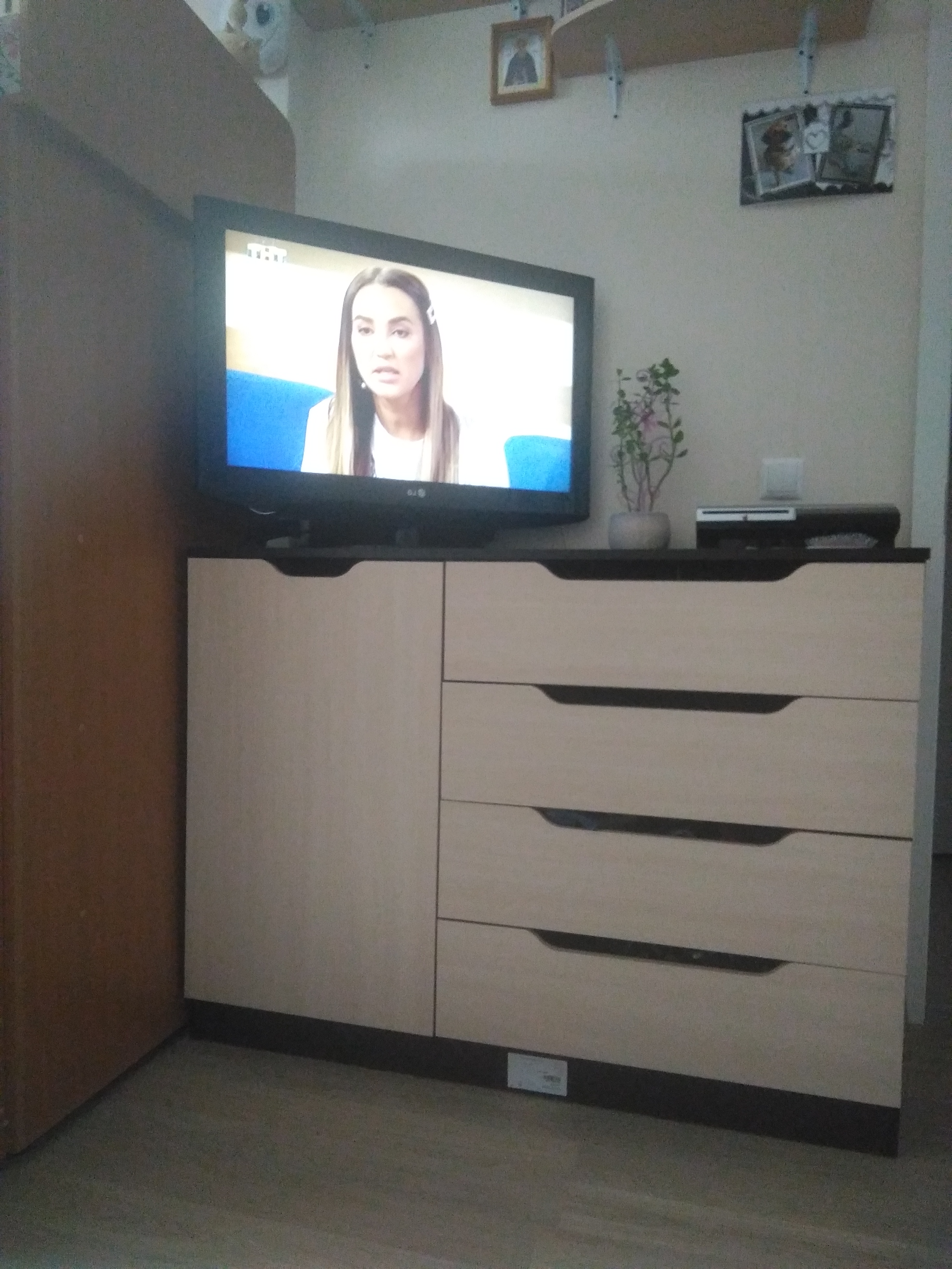 Комод замечательный, привезли вовремя! Цвет и размеры совпадают! Минус то что наклейки очень плохо снимаются, они очень большие, приходится оттирать! Цена и качество соответствует